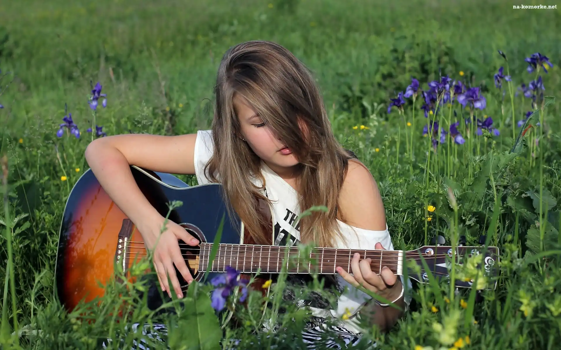 Gitara, Łąka, Trawa, Kwiaty, Dziewczyna na Komórkę