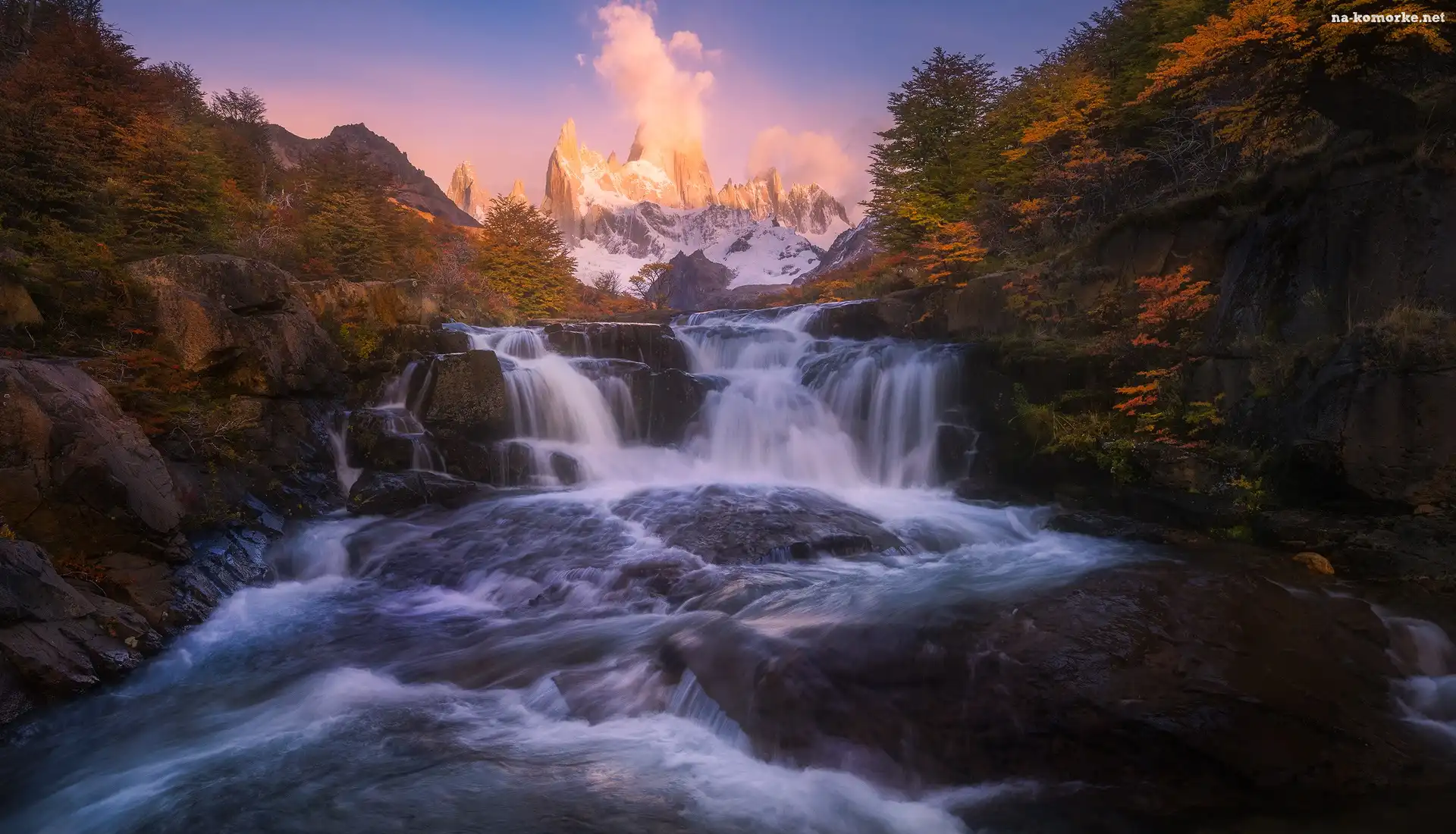 Drzewa, Szczyt, Jesień, Góry Andy, Park Narodowy Los Glaciares, Patagonia, Argentyna, Fitz Roy, Rzeka na Komórkę |
