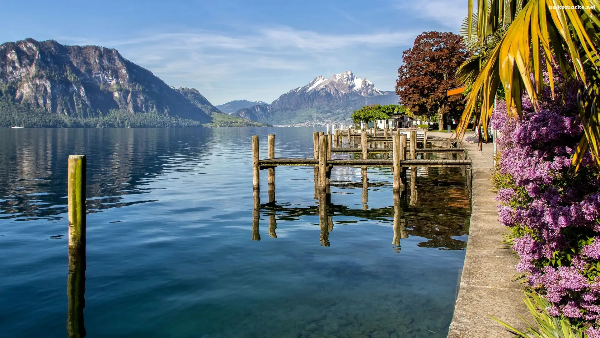 Gmina Weggis, Szwajcaria, Pomosty, Jezioro Czterech Kantonów, Bez, Kanton Lucerna, Kwiaty, Góry, Drzewa na Komórkę |
