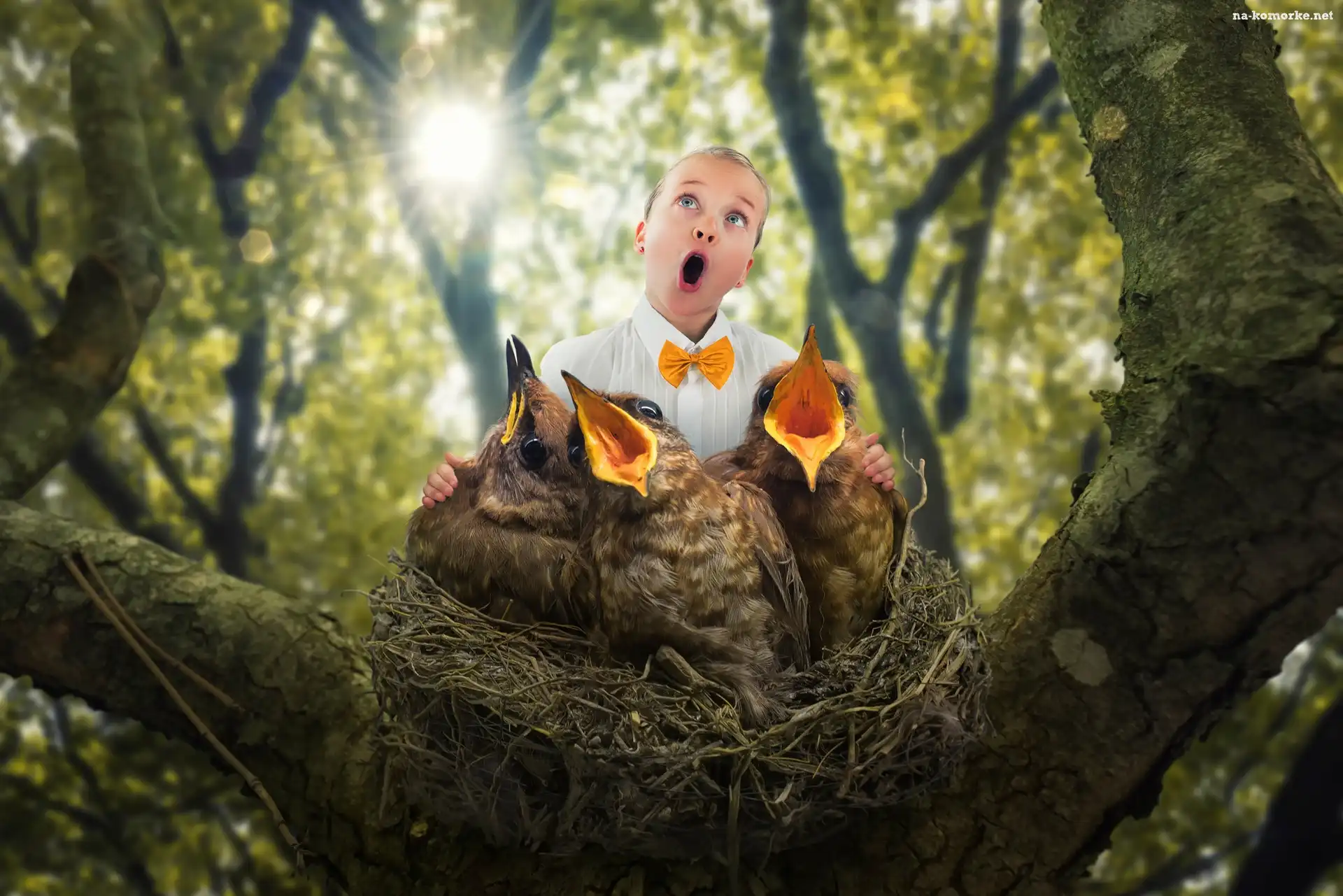 Gniazdo, Drzewo, Śmieszne, Chór, Ptaki, Dziecko na Komórkę