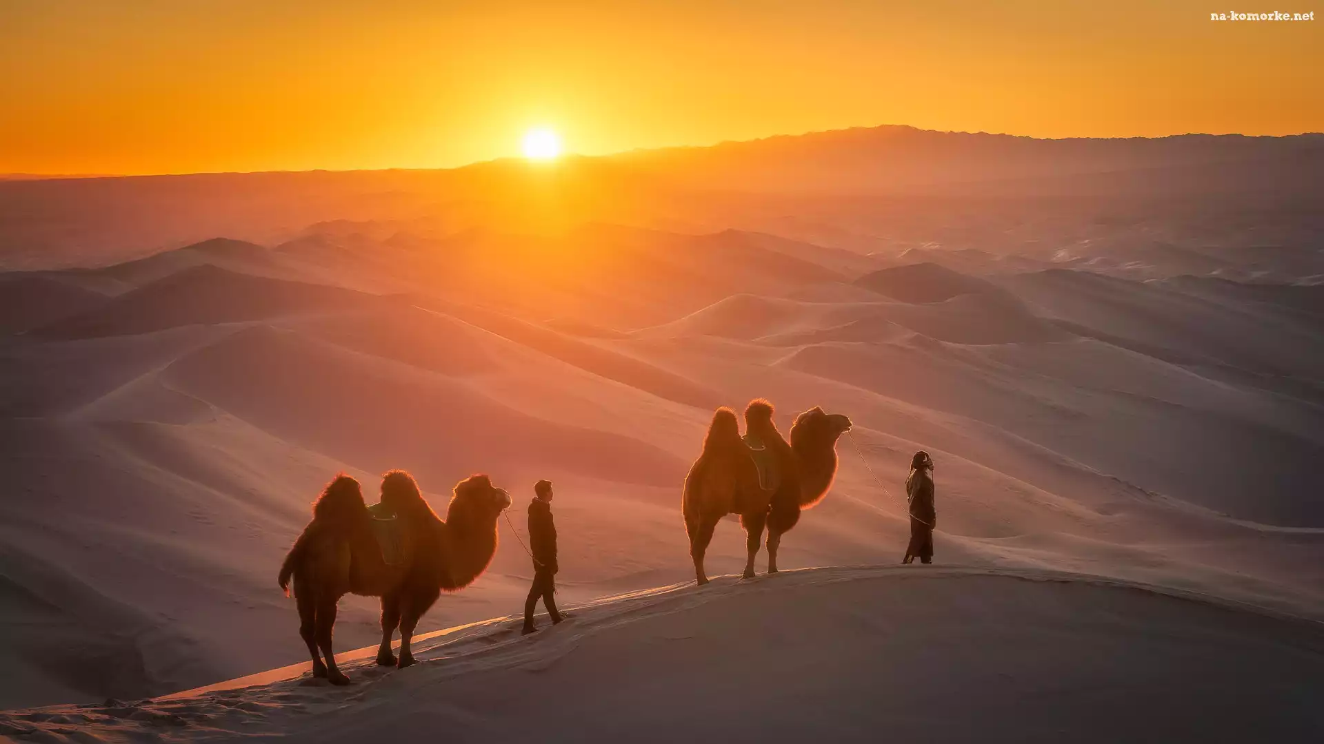 Gobi, Człowiek, Karawana, Mongolia, Wielbłądy, Zachód słońca, Wydmy, Pustynia na Komórkę