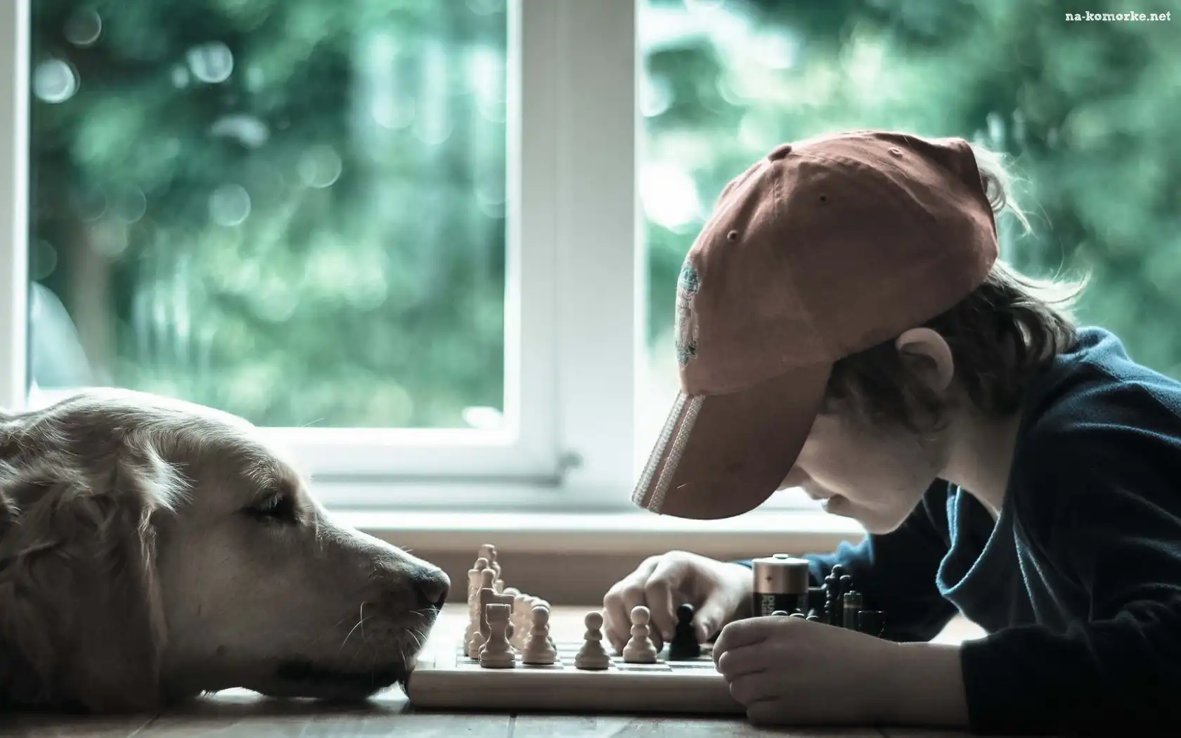 Golden Retriever, Chłopiec, Szachy na Komórkę