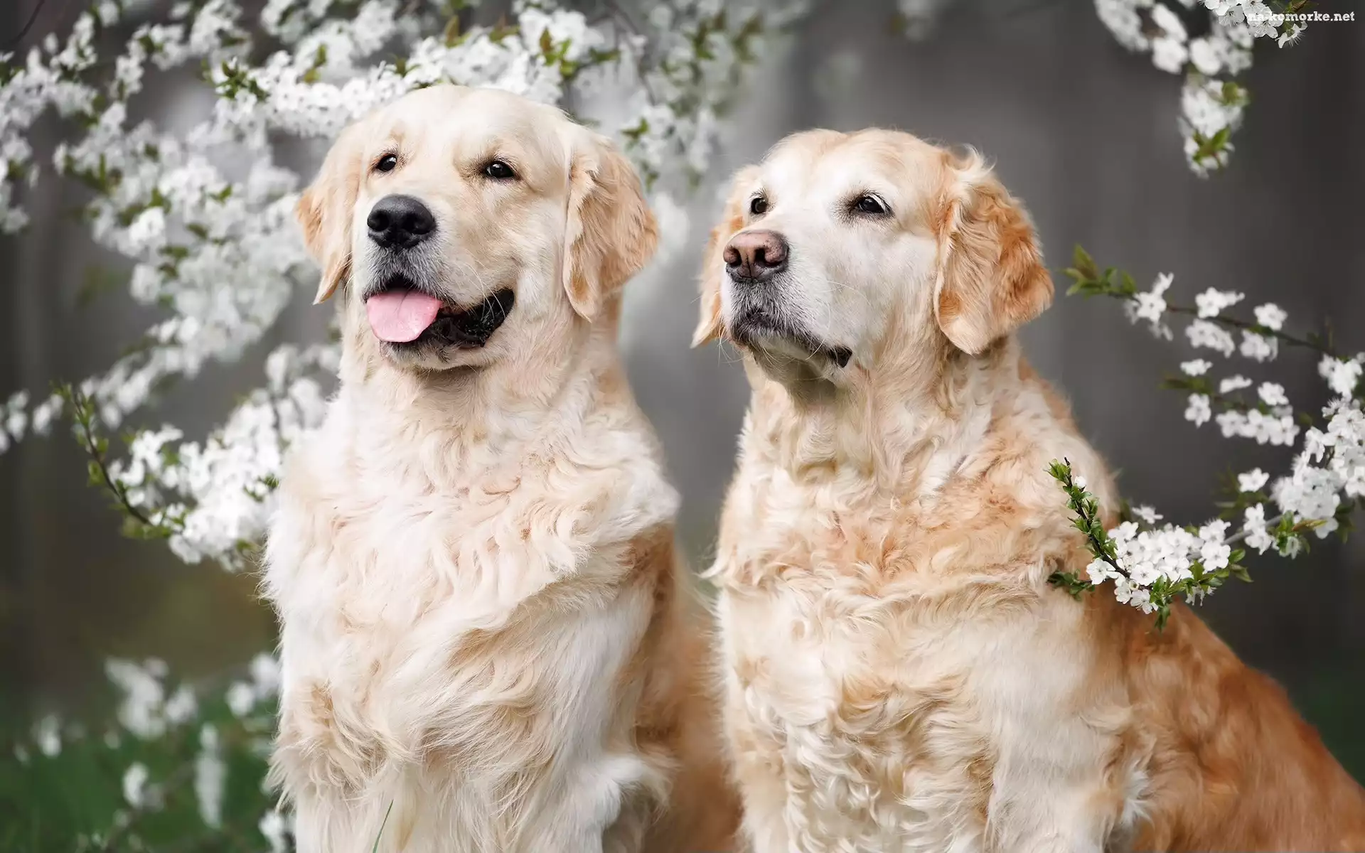 Psy, Dwa, Gałązki, Golden retriever, Kwiaty na Komórkę
