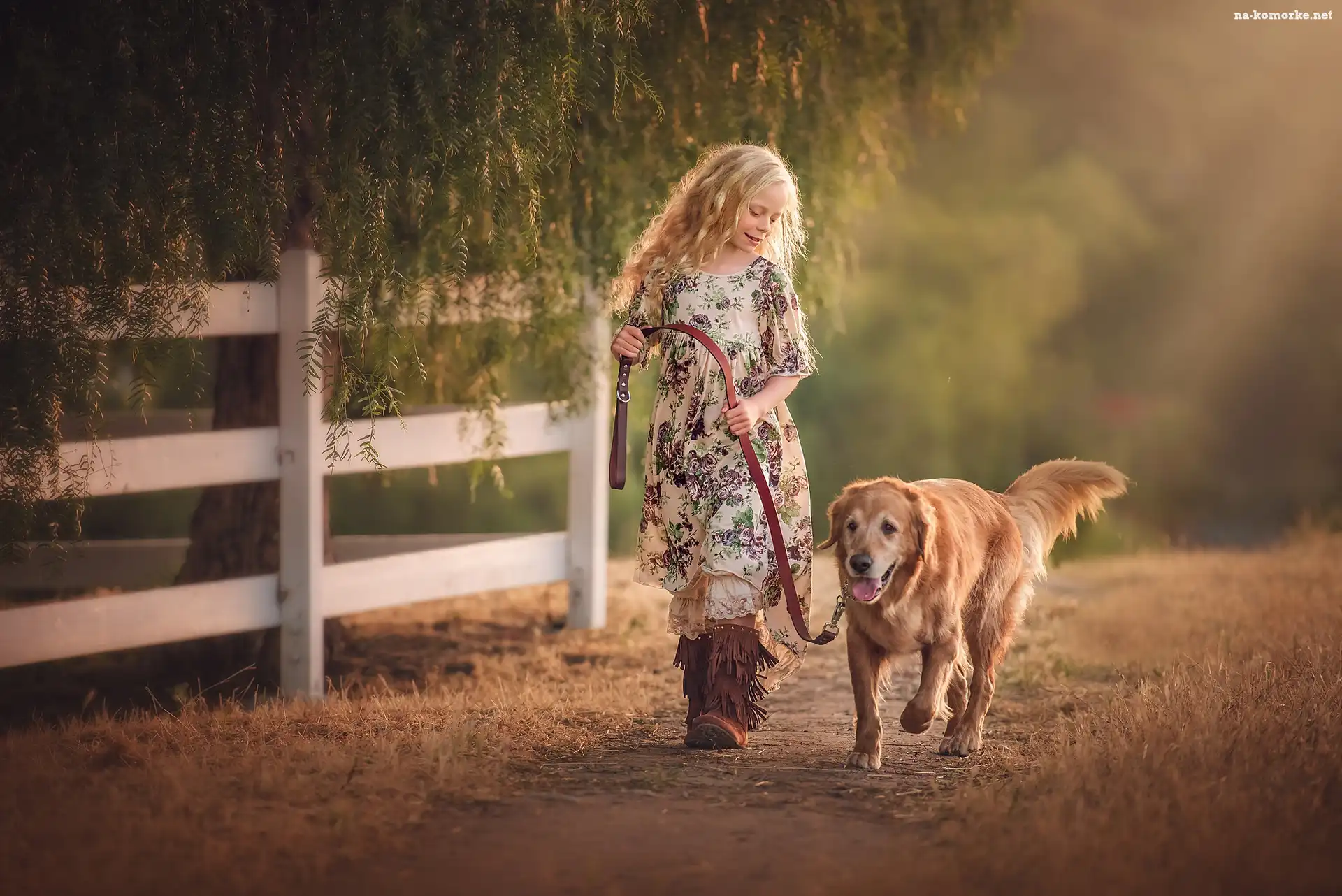 Drzewo, Golden retriever, Spacer, Płot, Ścieżka, Dziewczynka, Pies na Komórkę