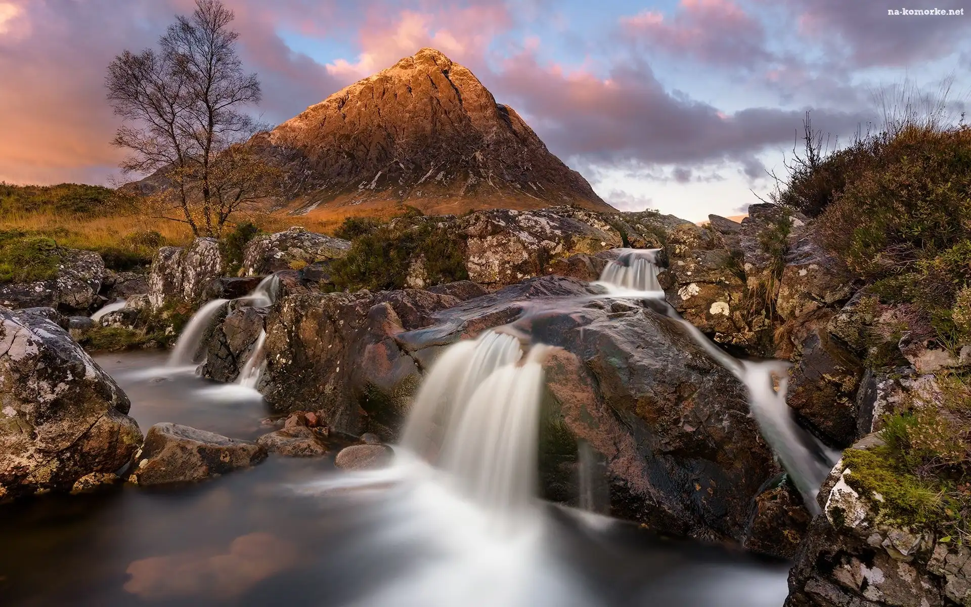 Skały, Szczyt Buachaille Etive Mor, Chmury, Góra, Dolina Glen Coe, Rejon Highland, Szkocja, Rzeka Coupall, Roślinność na Komórkę |