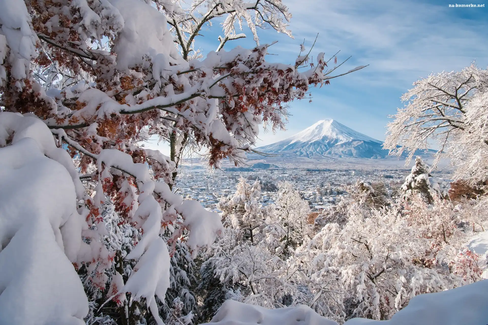 Góra, Drzewa, Zima, Japonia, Dolina, Fuji na Komórkę