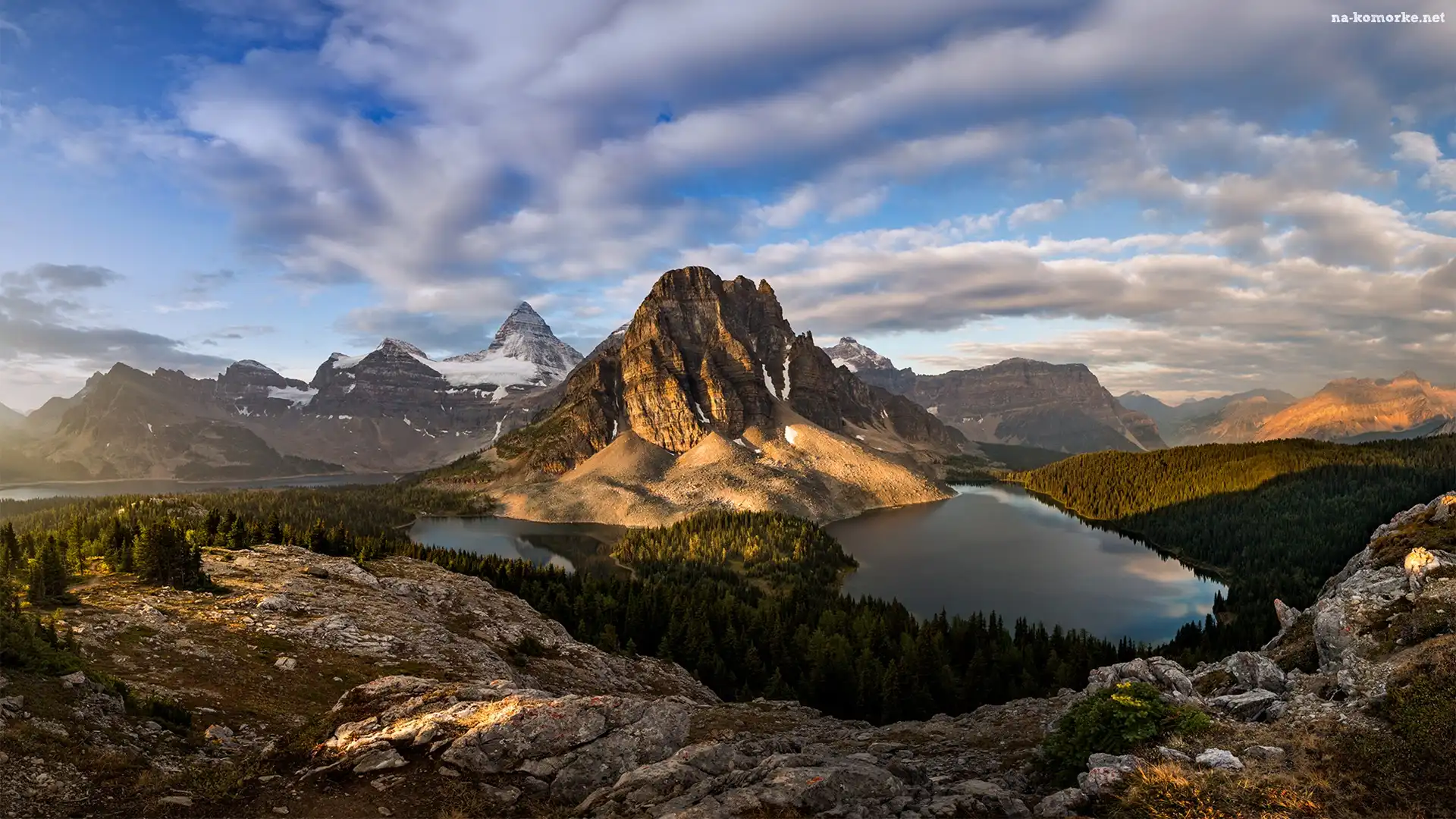 Góra Mount Assiniboine, Park Prowincjonalny Mount Assiniboine, Kolumbia Brytyjska, Jezioro Cerulean, Poranek, Góry, Chmury, Jezioro Sunburst Lake, Kanada na Komórkę |