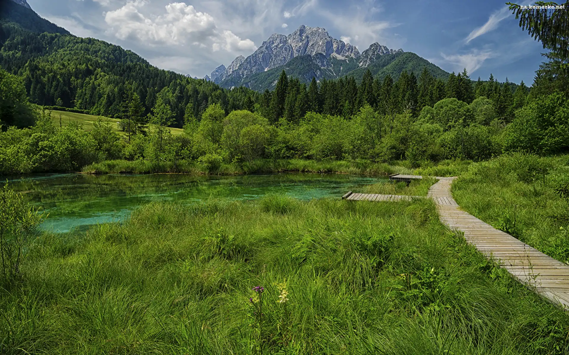 Góry, Kranjska Gora, Jezioro, Słowenia, Lasy, Rezerwat przyrody Zelenci, Trawa, Pomost na Komórkę