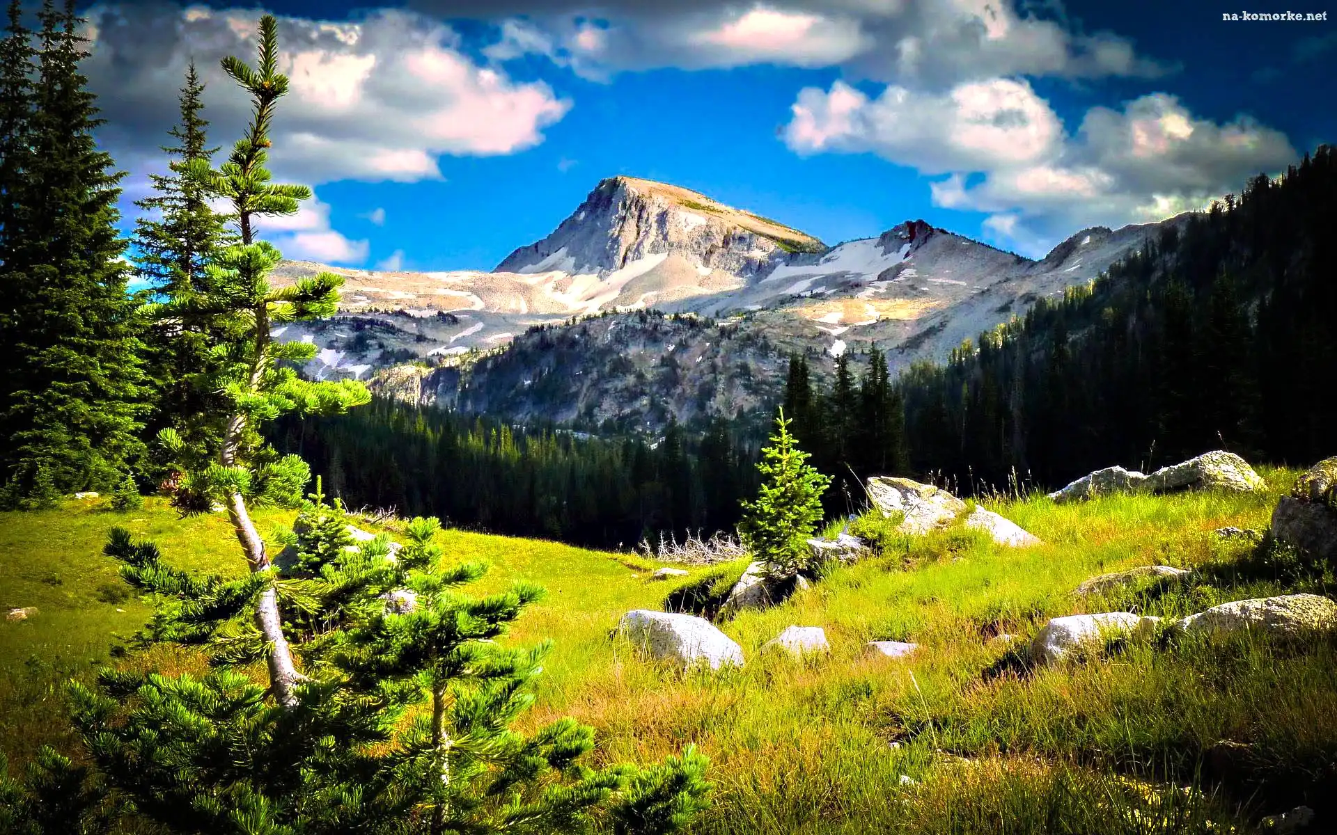 Góry, Choinki, Chmury, Trawa na Komórkę