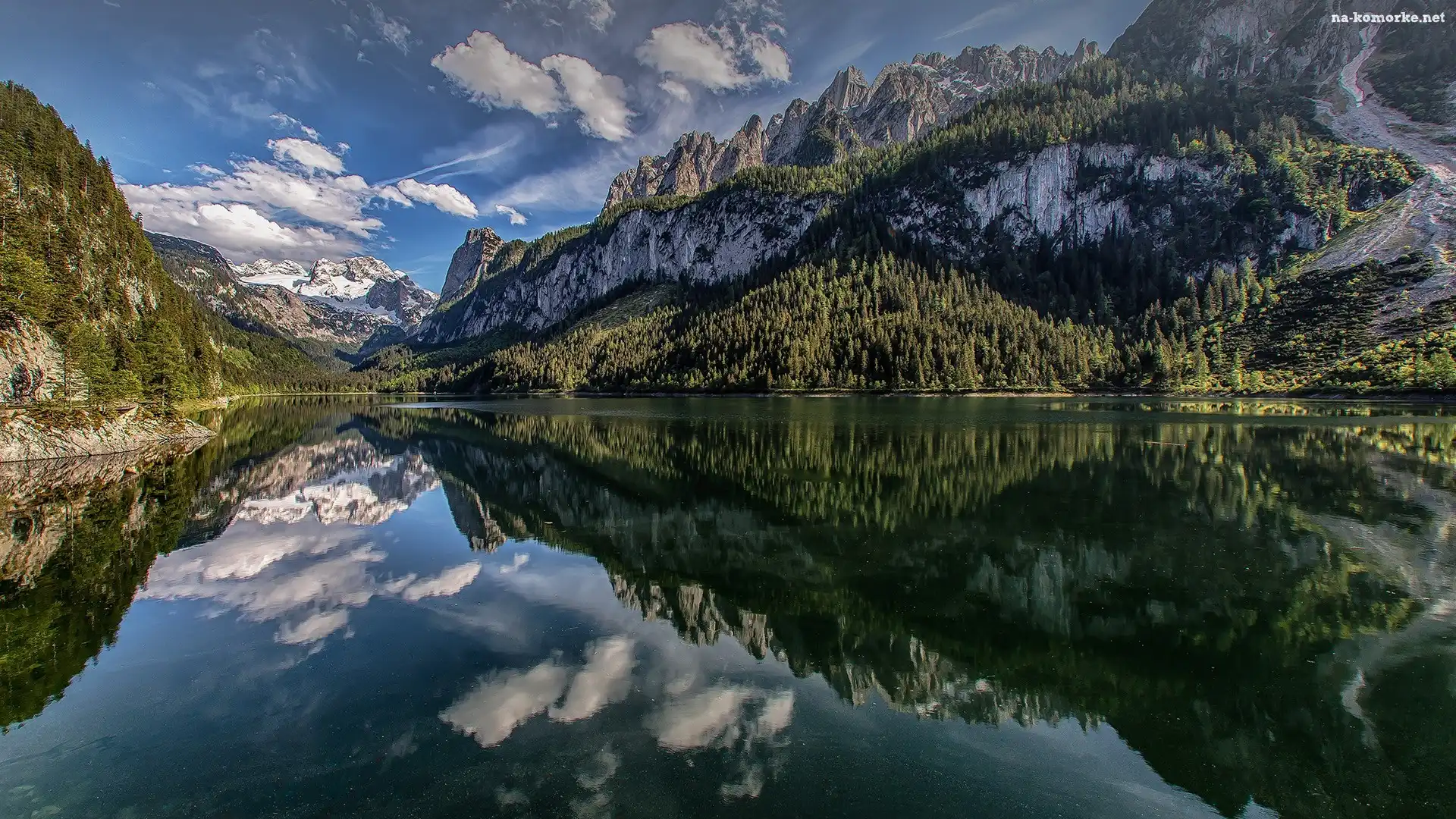 Drzewa, Góry Dachstein, Austria, Odbicie, Jezioro Gosau, Chmury na Komórkę