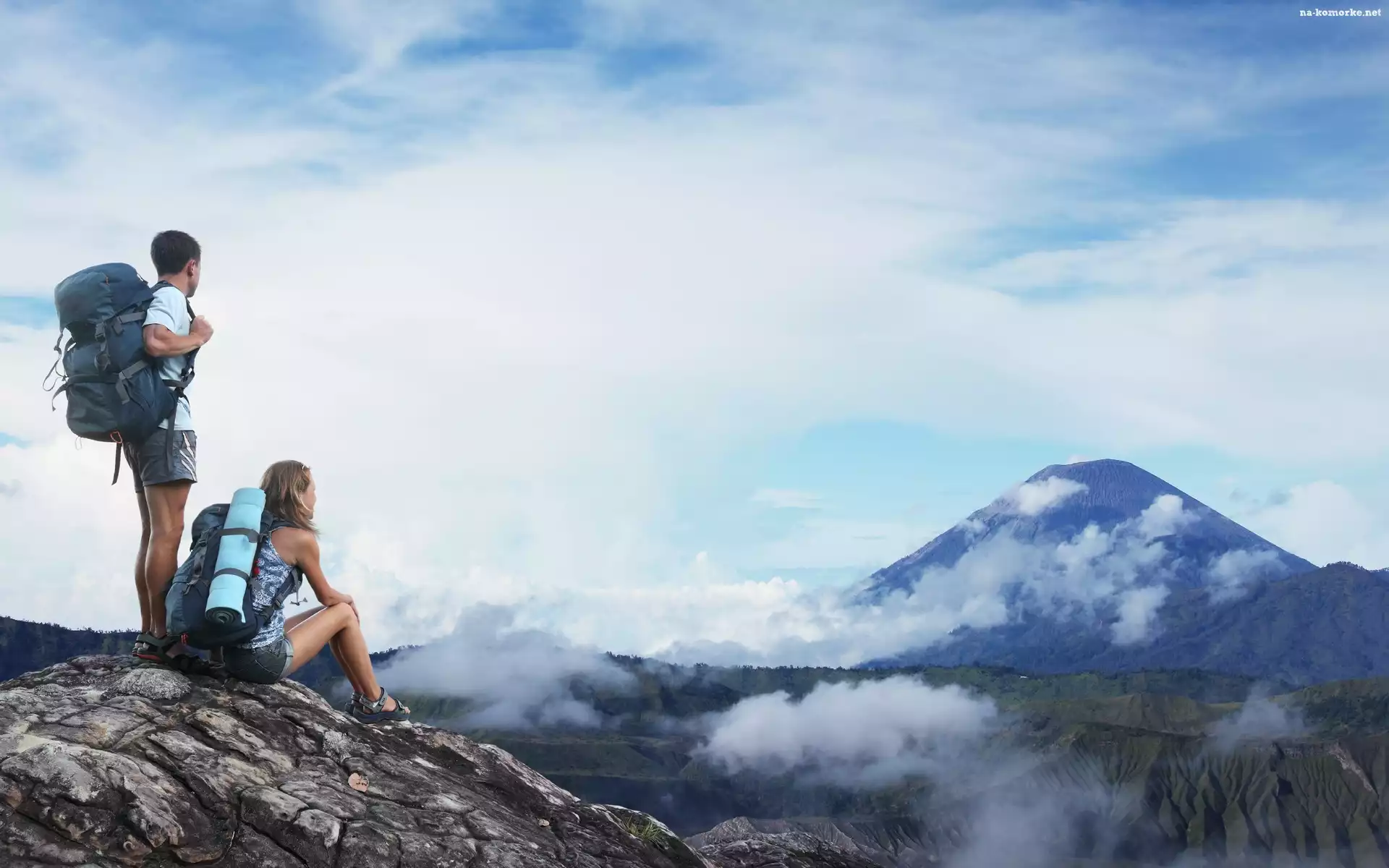 Góry, Turyści, Chmury, Skały na Komórkę