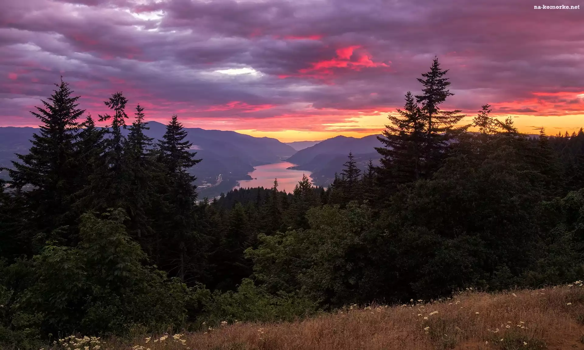 Zachód słońca, Rzeka Kolumbia, Stany Zjednoczone, Góry Kaskadowe, Drzewa, Columbia River Gorge, Góry, Chmury, Stan Waszyngton na Komórkę |