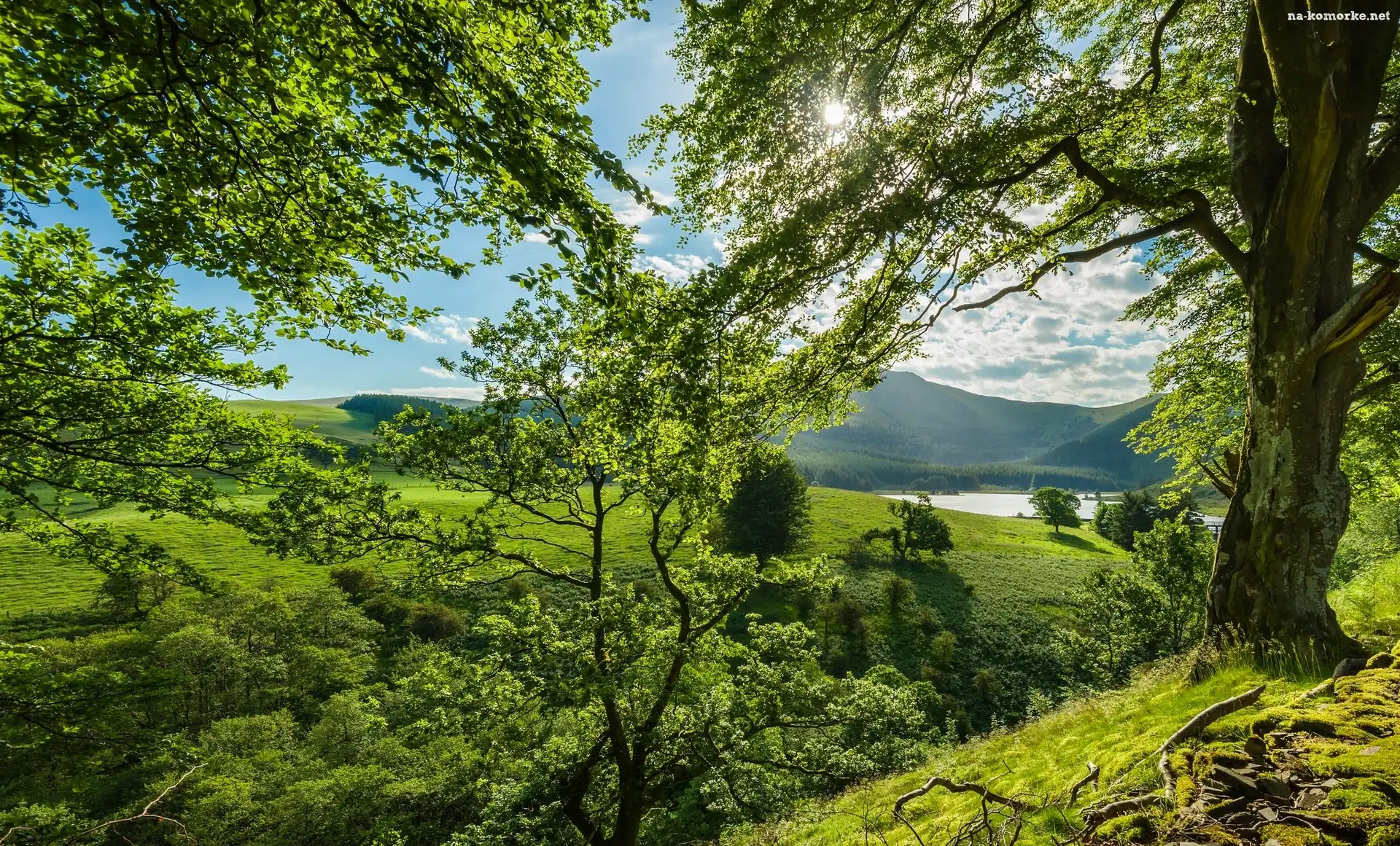 Góry, Drzewa, Słońce, Dolina, Rzeka na Komórkę