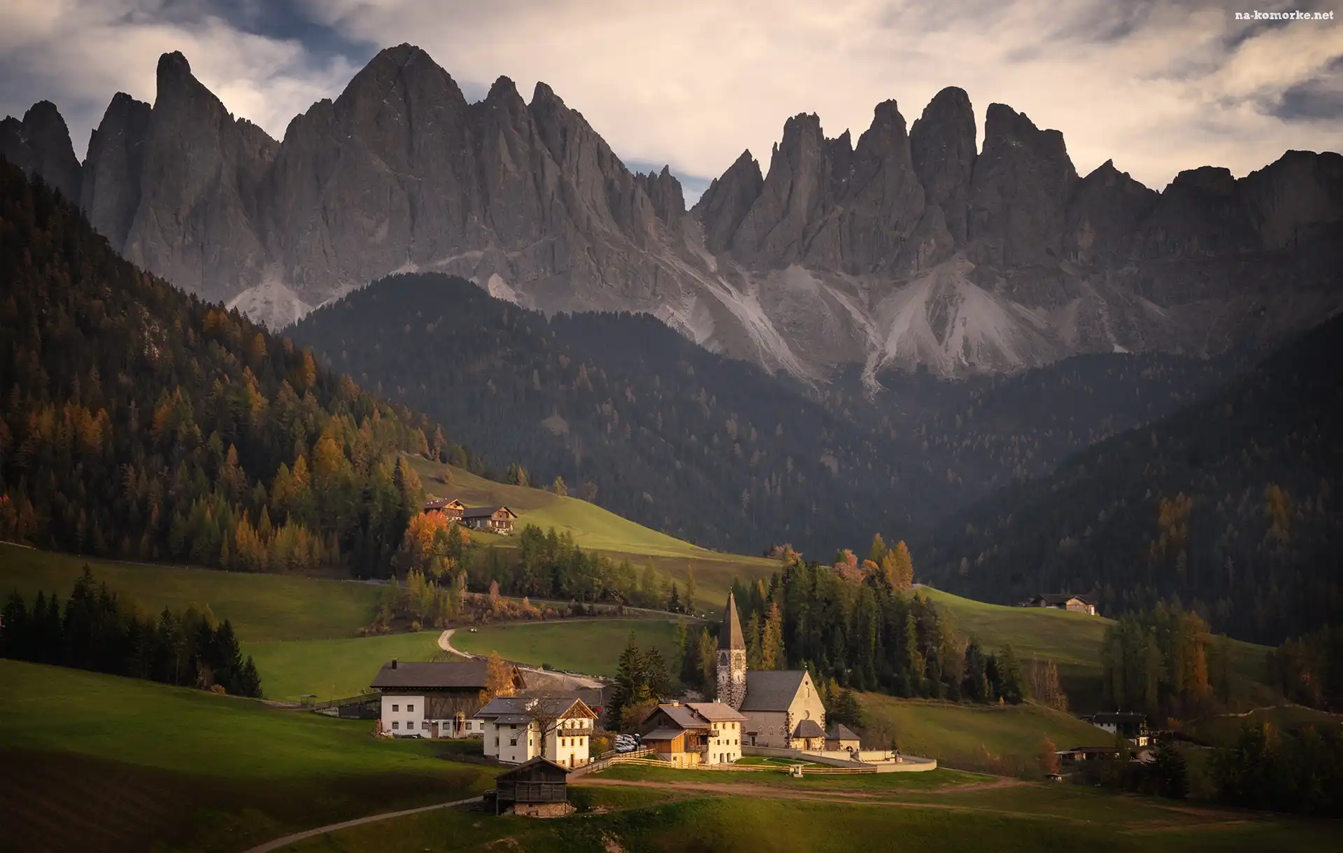 Góry, Drzewa, Las, Dolomity, Włochy, Kościół, Santa Maddalena, Masyw Odle, Dolina Val di Funes, Domy, Wieś na Komórkę |