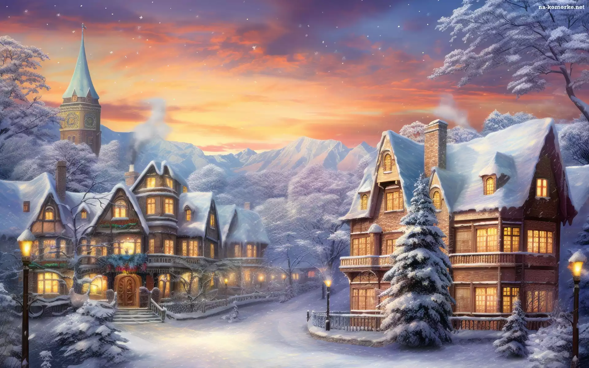 Miasteczko, Latarnie, Droga, Zima, Drzewa, Grafika, Domy, Góry na Komórkę
