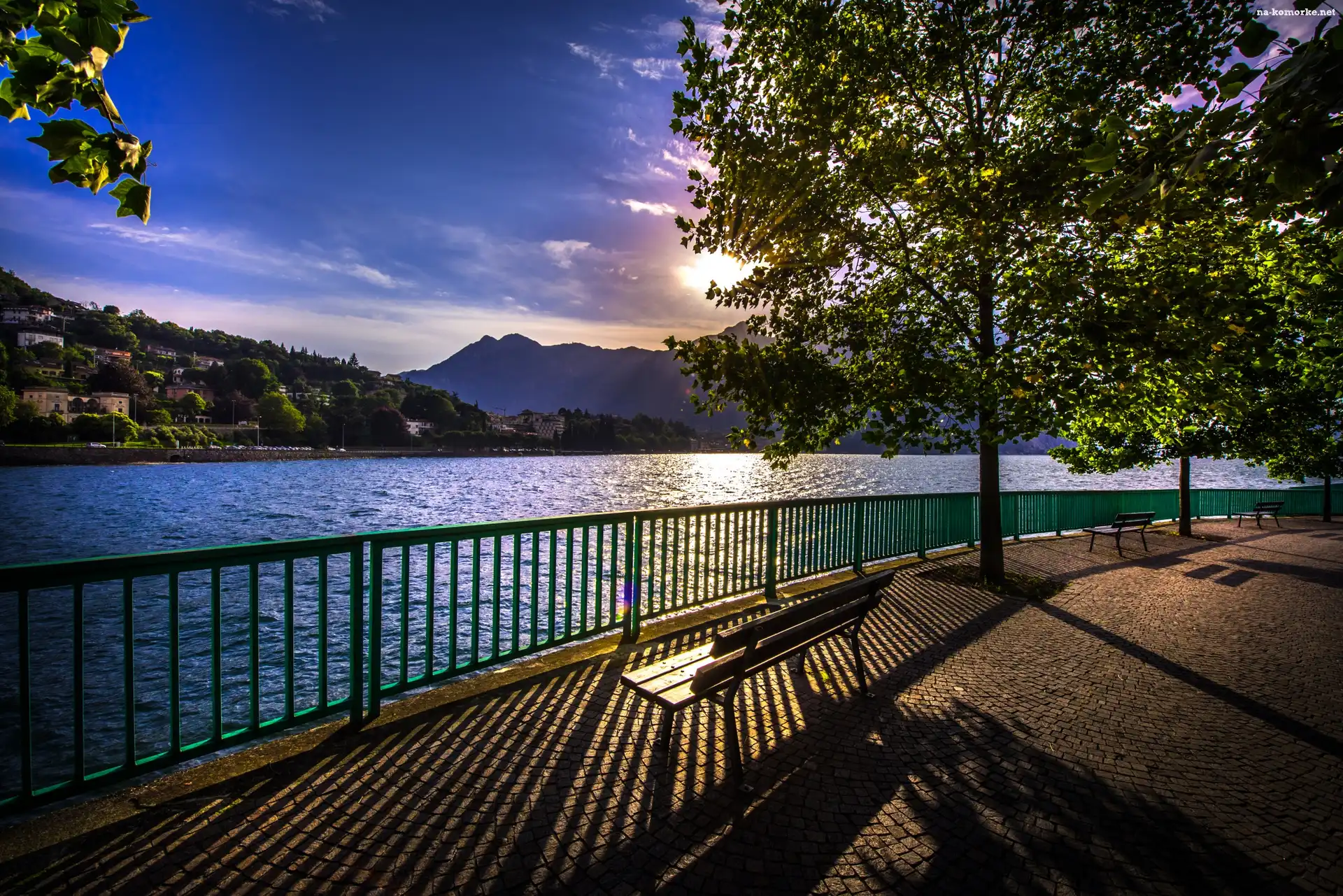 Włochy, Bulwar, Drzewa, Jezioro Como, Ławka, Wschód słońca, Góry na Komórkę