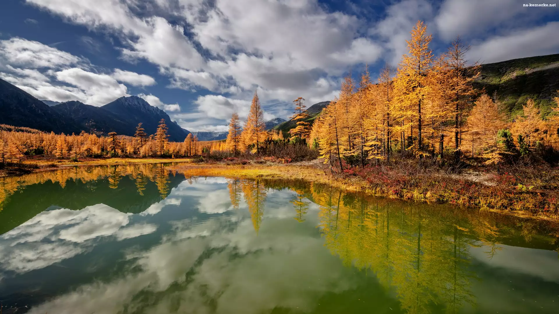 Góry, Jesień, Chmury, Jacka Londona, Jezioro, Kołyma, Rosja, Drzewa, Odbicie na Komórkę