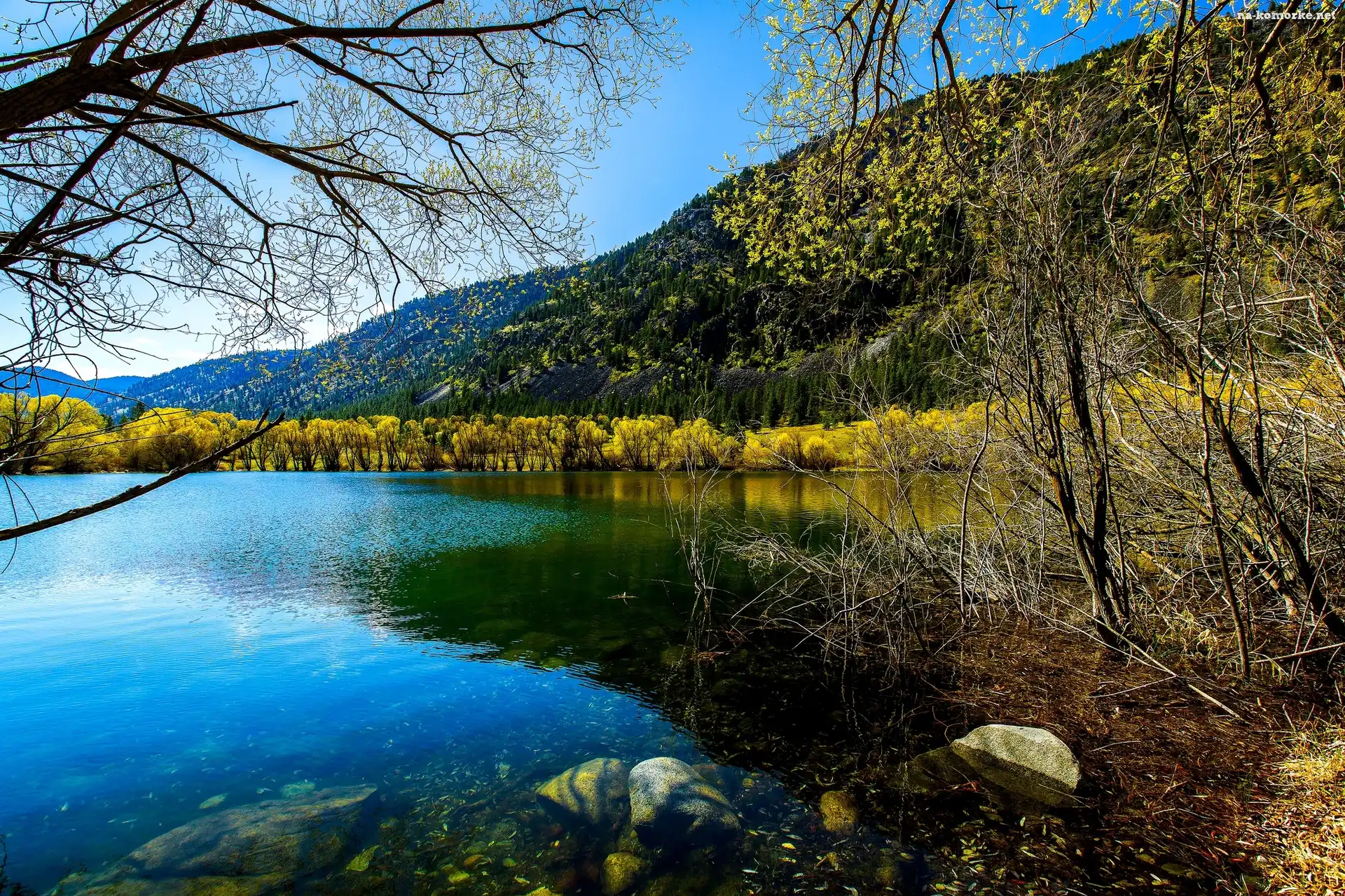 Góry, Jesień, Jezioro, Drzewa , Kamienie na Komórkę
