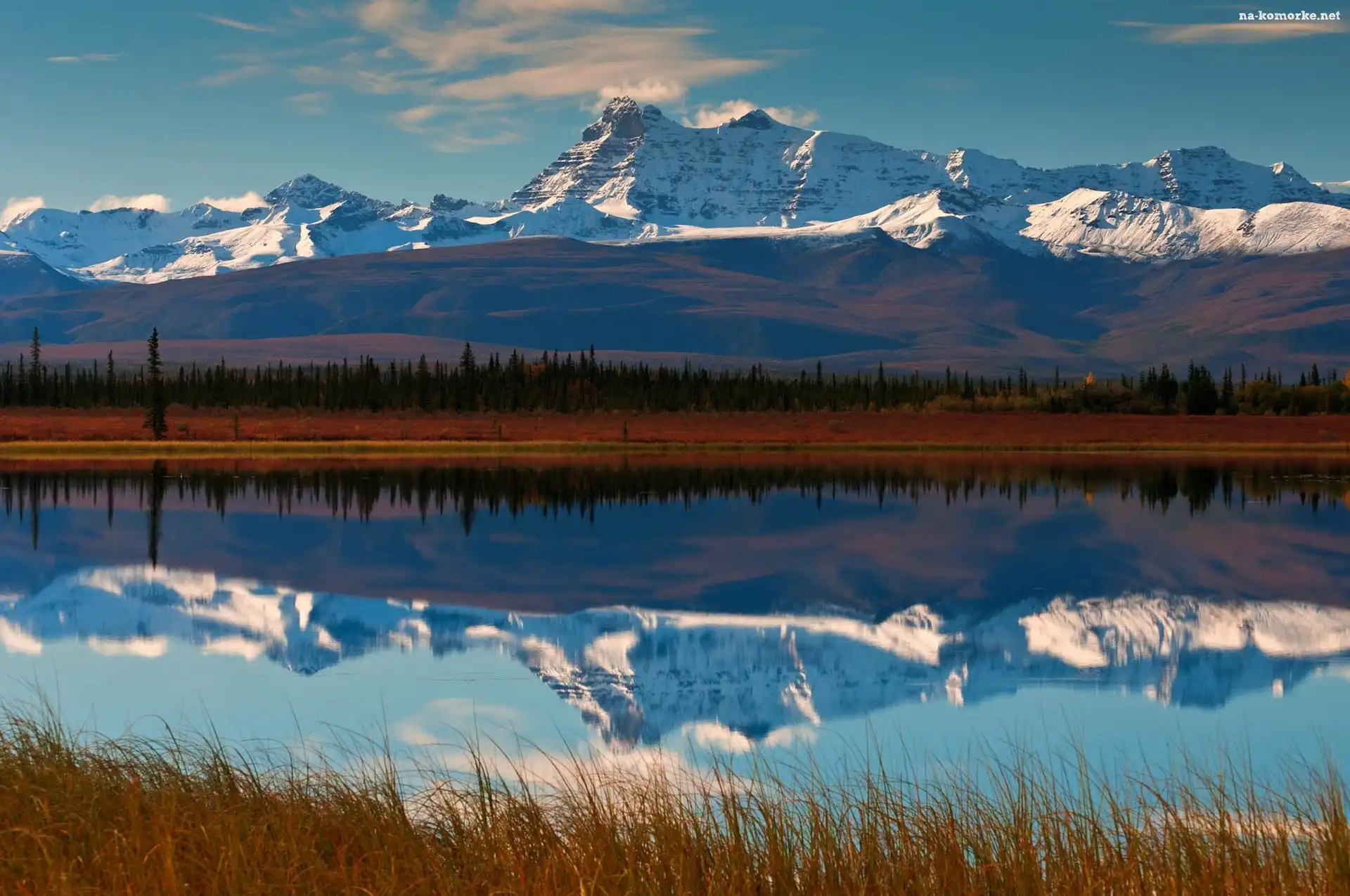 Góry, Odbicie, Drzewa, Woda na Komórkę