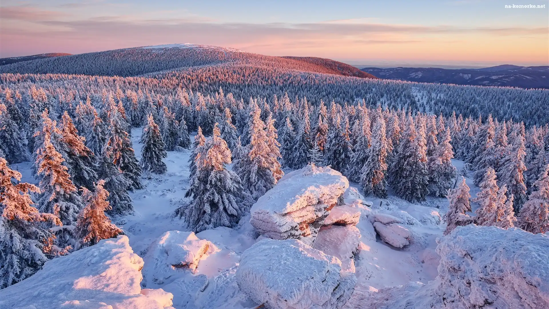 Drzewa, Góry, Zima, Wschód słońca, Ośnieżone, Skały na Komórkę