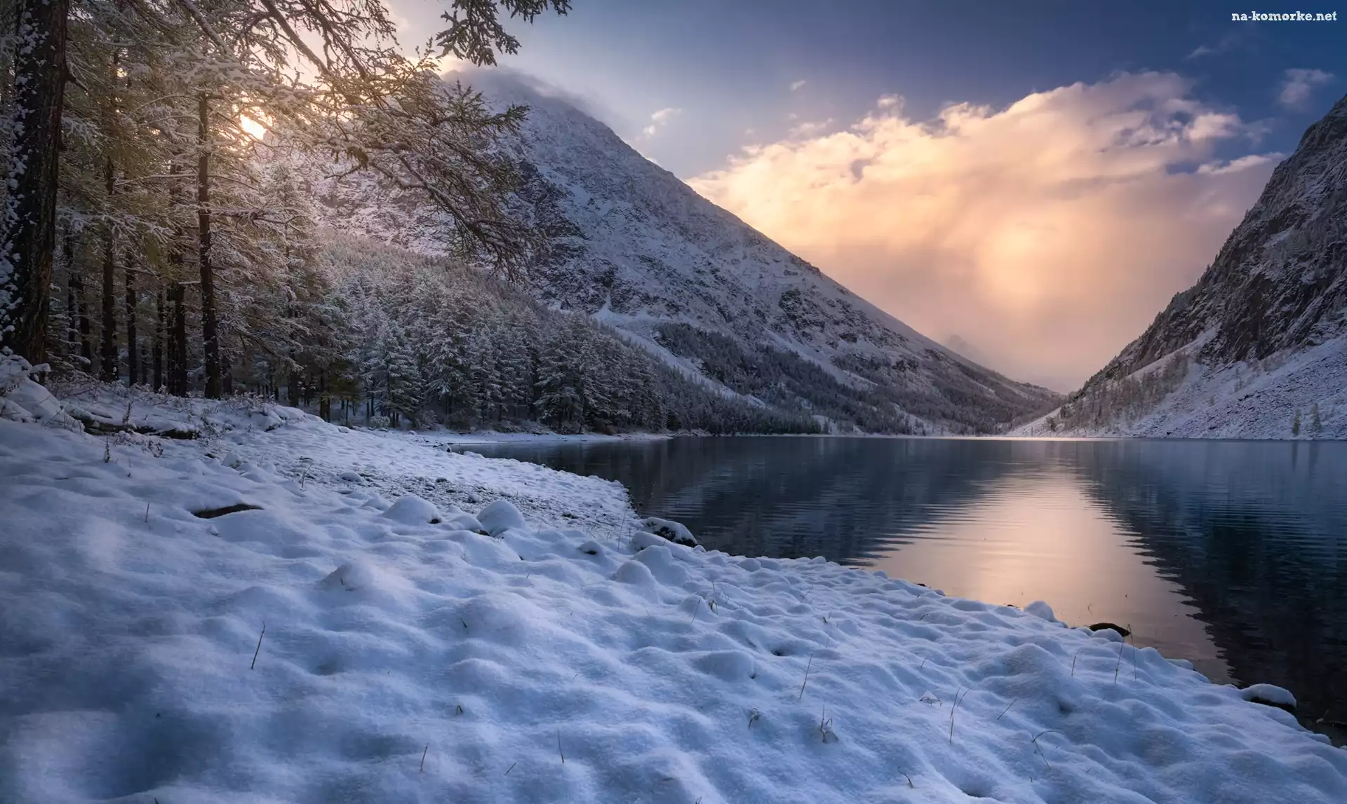 Drzewa, Góry, Zima, Chmury, Jezioro, Wschód słońca na Komórkę