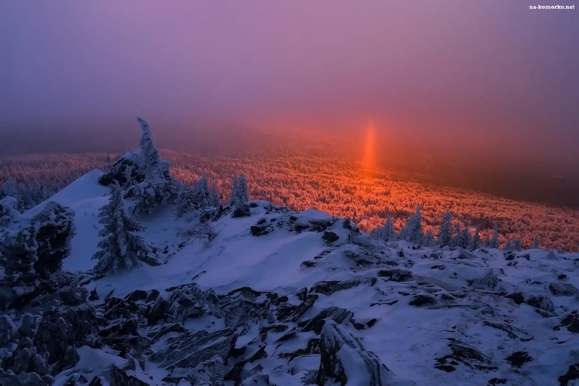 Drzewa, Góry, Zima, Mgła, Szczyt, Zachód słońca na Komórkę