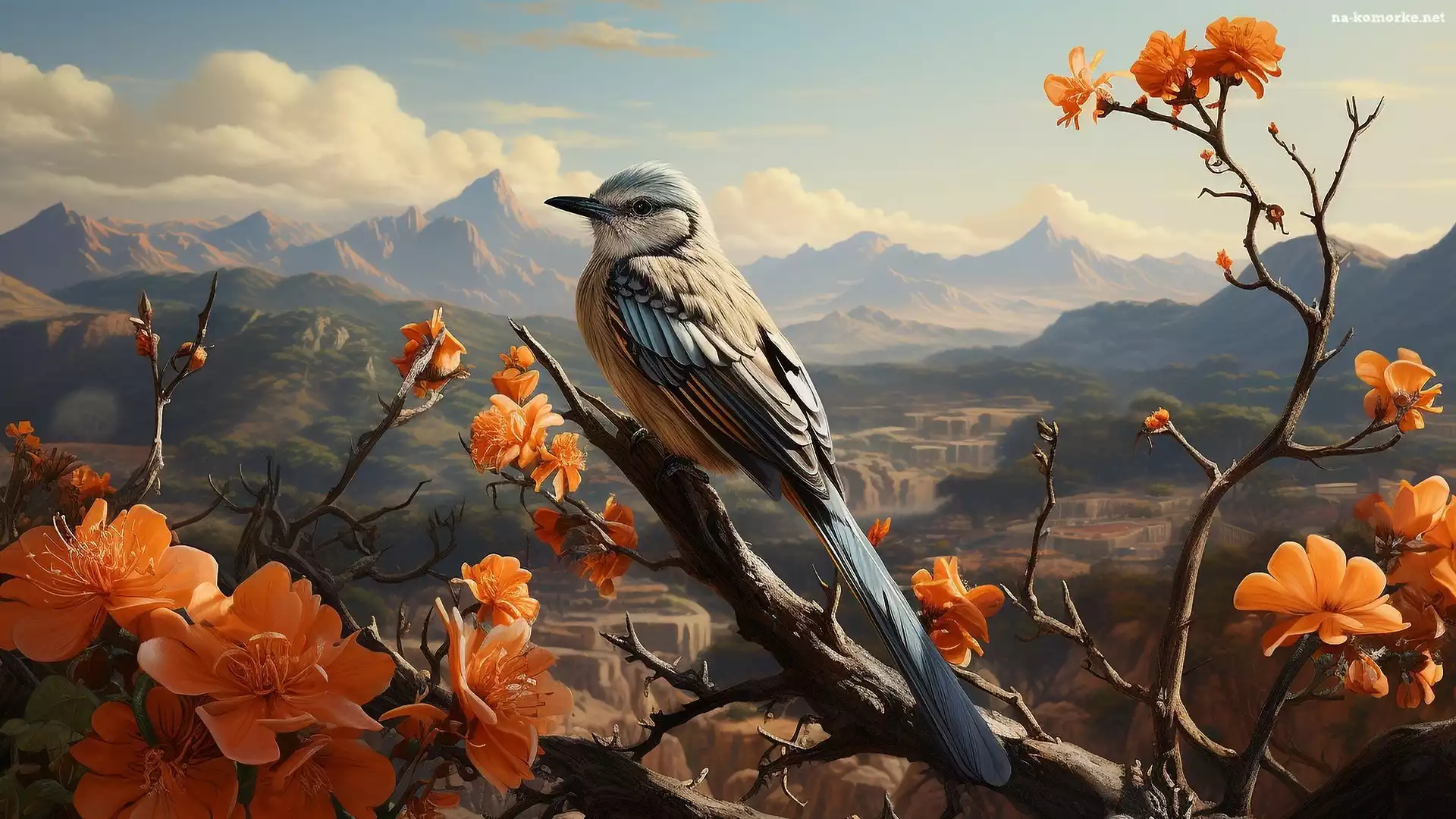 Pomarańczowe, Kwiaty, Grafika, Góry, Drzewo, Gałęzie, Ptak na Komórkę