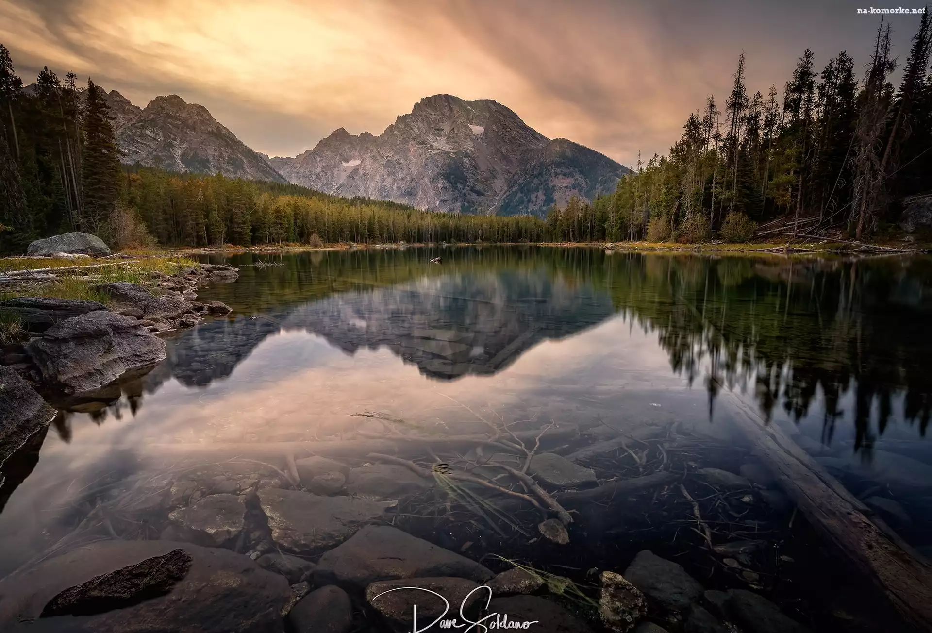 Góry, Stan Wyoming, Stany Zjednoczone, Szczyt Mount Moran, Las, Jezioro String Lake, Park Narodowy Grand Teton na Komórkę |