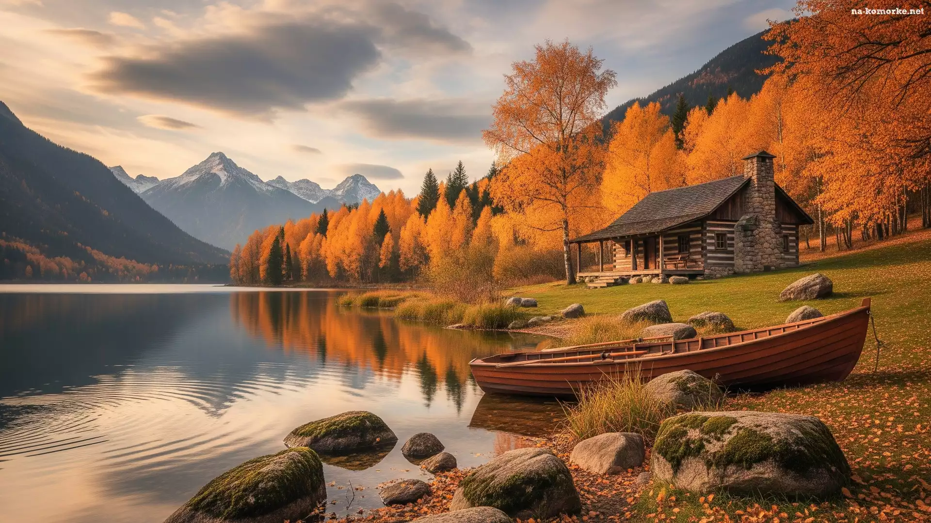 Dom, Drzewa, Jesień, Góry, Kamienie, Łódka, Jezioro na Komórkę