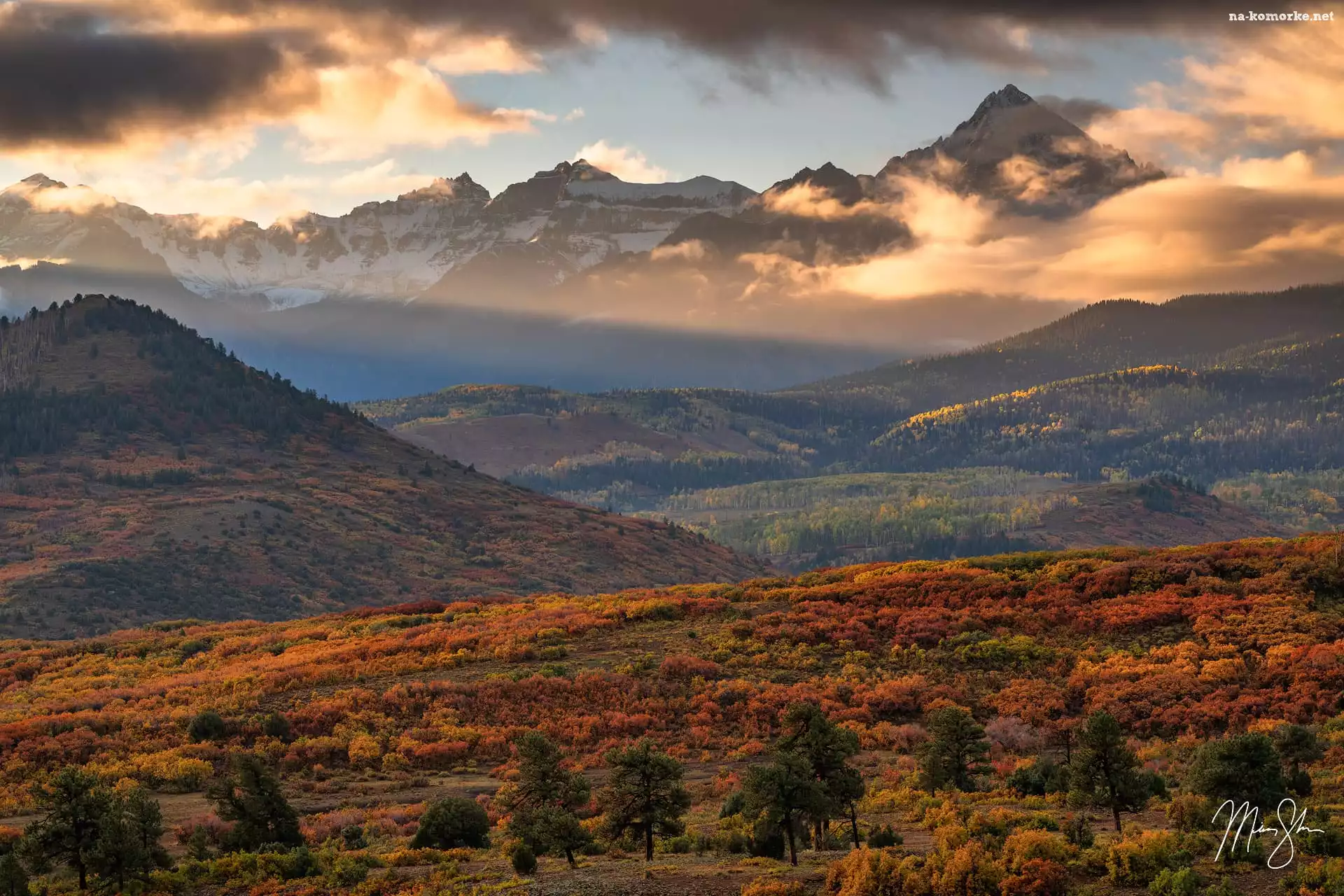 Góry, Drzewa, Lasy, Zachód słońca, Kolorowe, Jesień, Wzgórza, Mgła na Komórkę