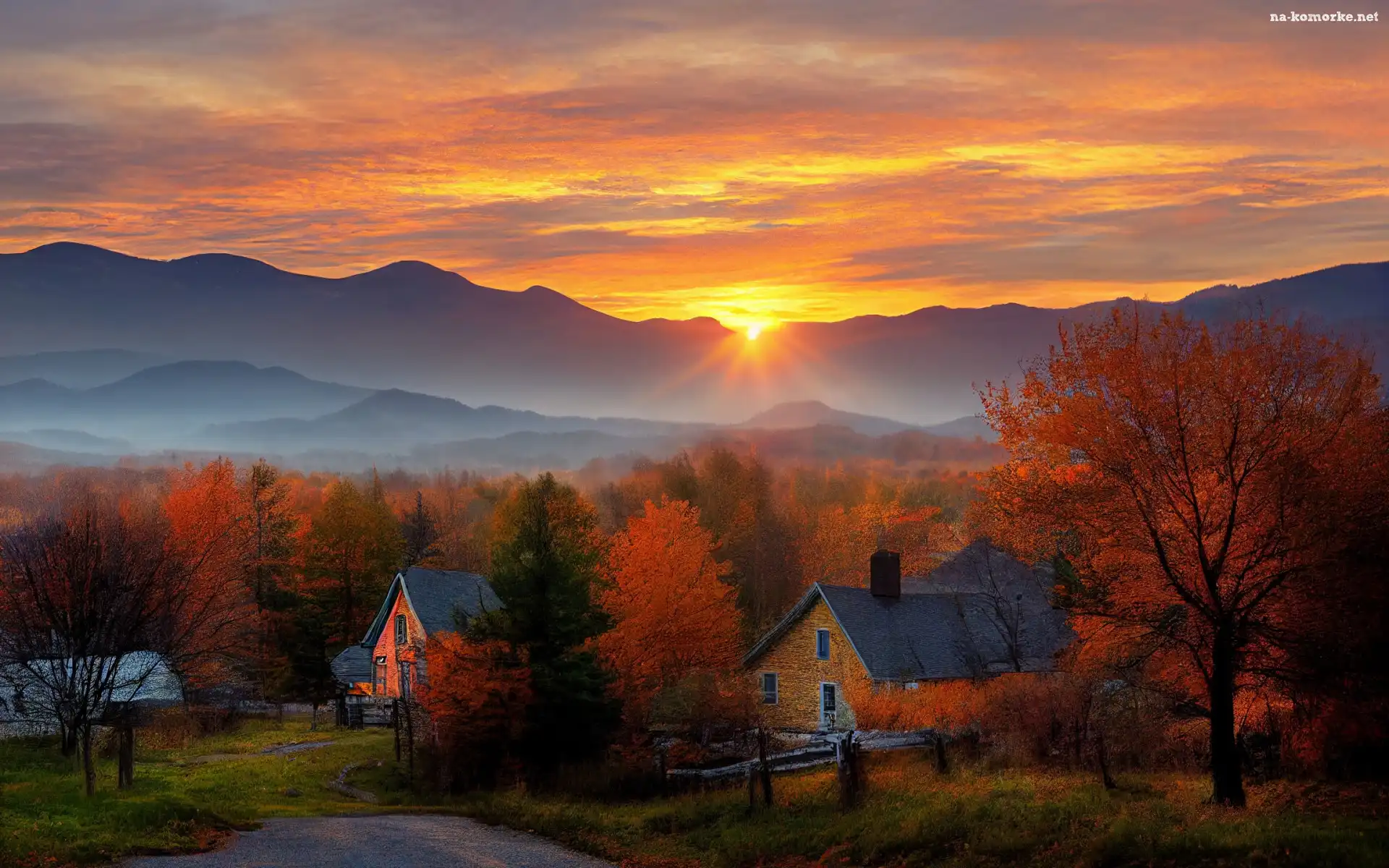 Mgła, Niebo, Jesień, Zachód słońca, Drzewa, Domy, Góry na Komórkę