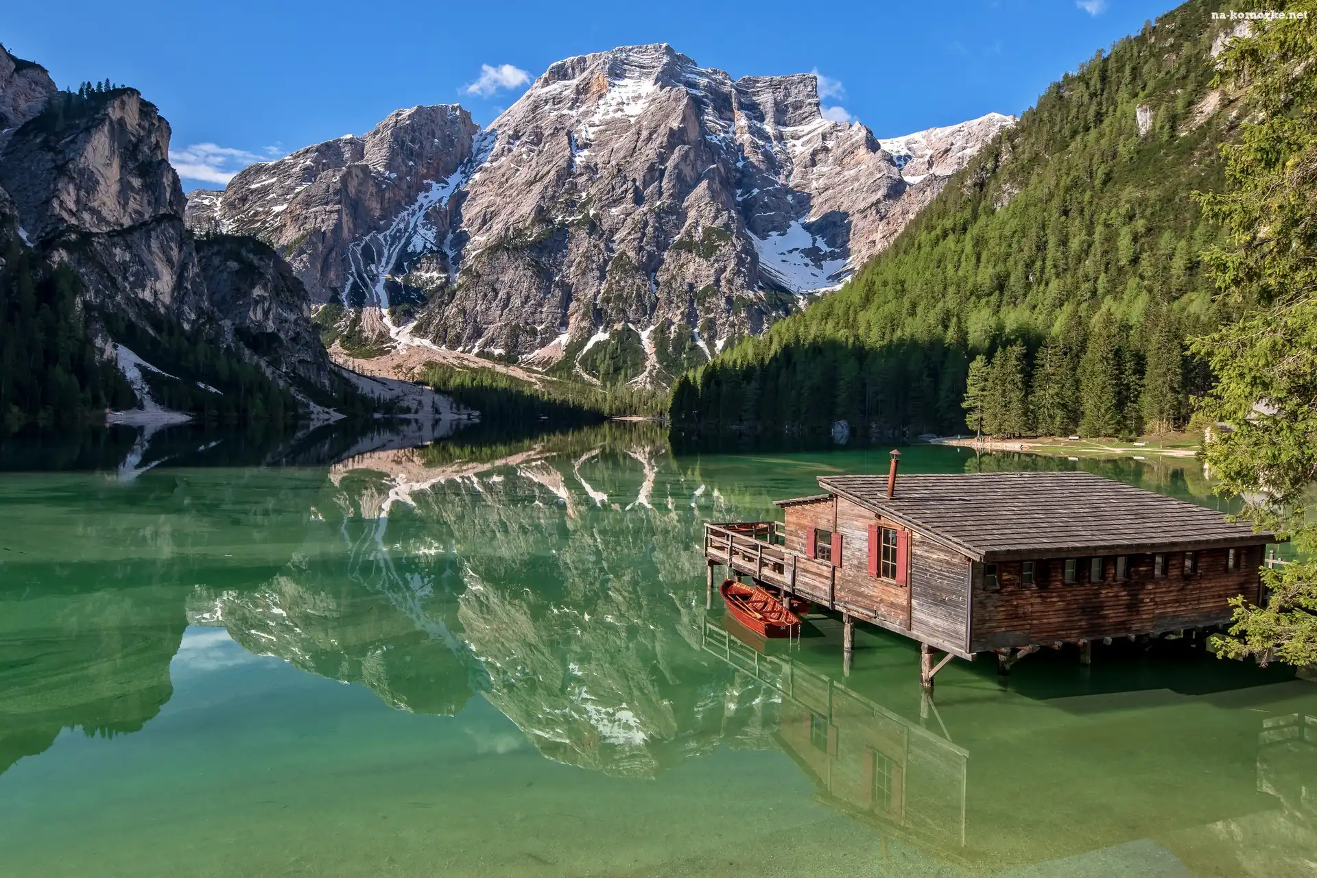 Jezioro Pragser Wildsee, Włochy, Drewniany, Góry, Drzewa, Południowy Tyrol, Łódki, Dolomity, Dom na Komórkę |