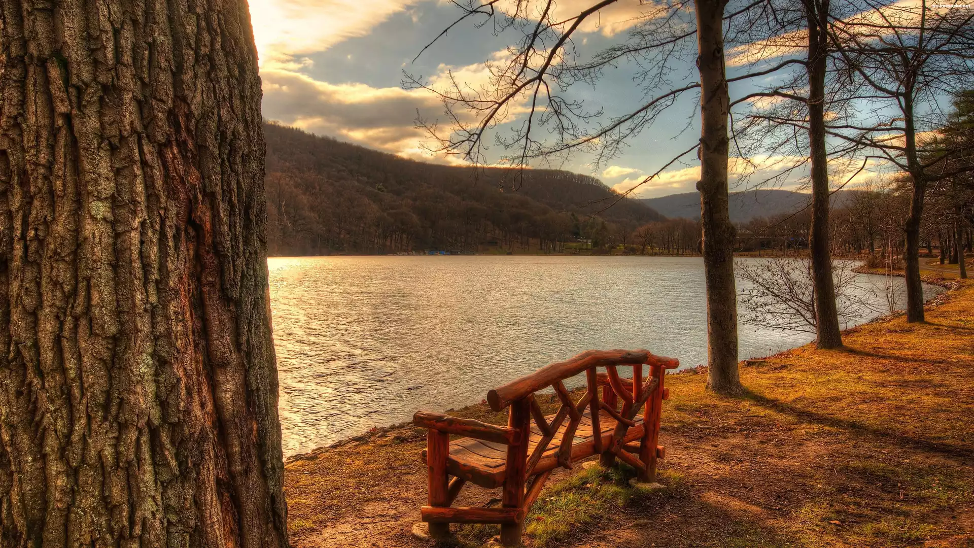 Góry, Drzewa, Jezioro, Ławka na Komórkę