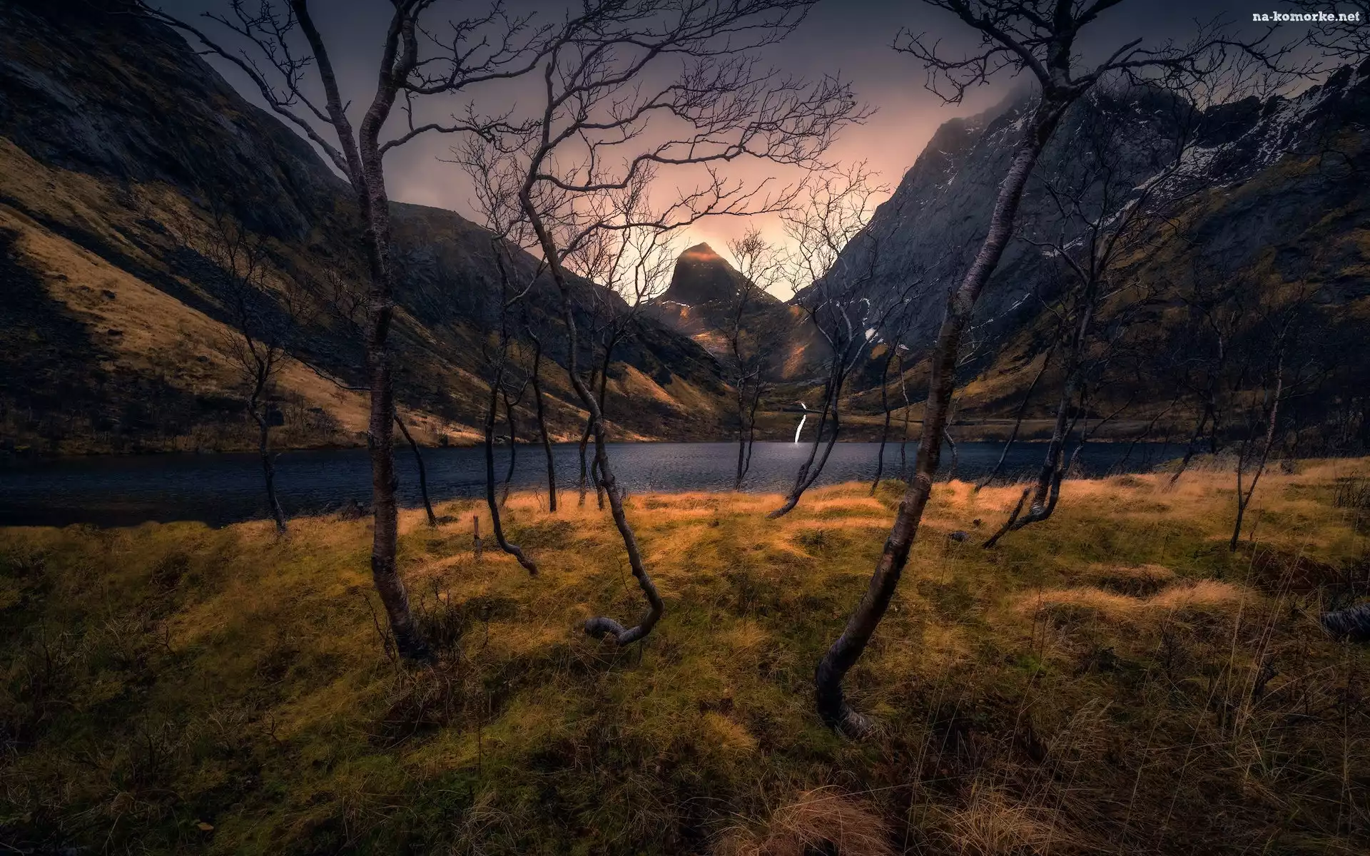 Norwegia, Góry, Jezioro, Senja, Drzewa na Komórkę