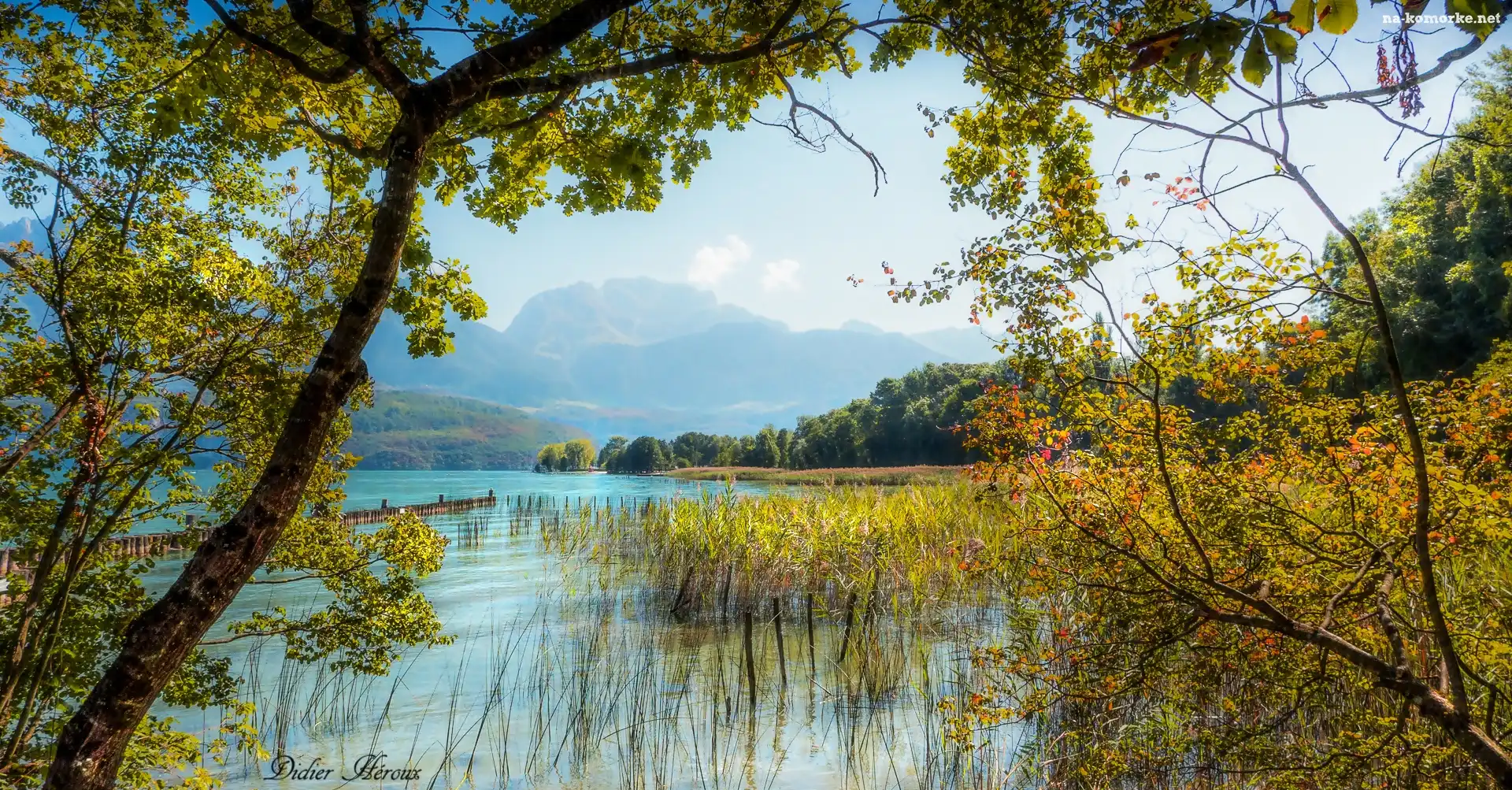 Góry, Drzewa, Jezioro, Trawy na Komórkę