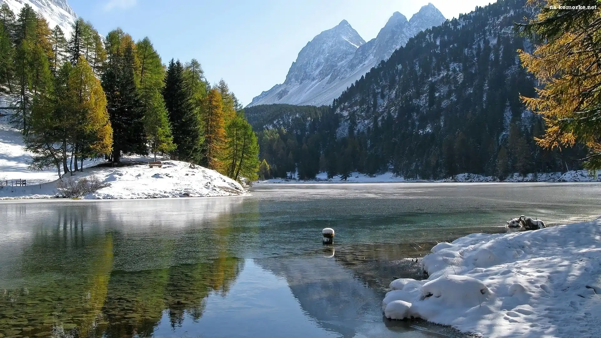 Góry, Śnieg, Jezioro, Drzewa na Komórkę
