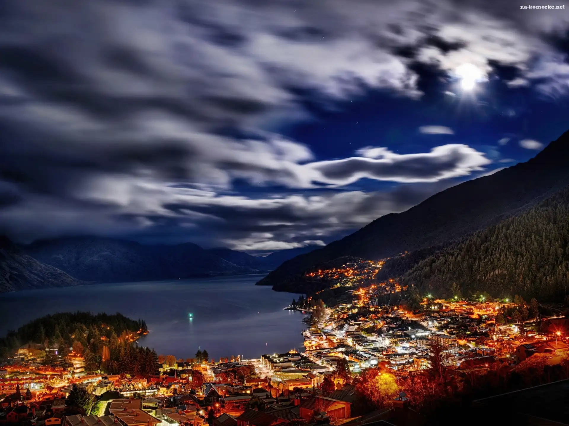 Góry, Nocą, Jezioro, Miasto na Komórkę