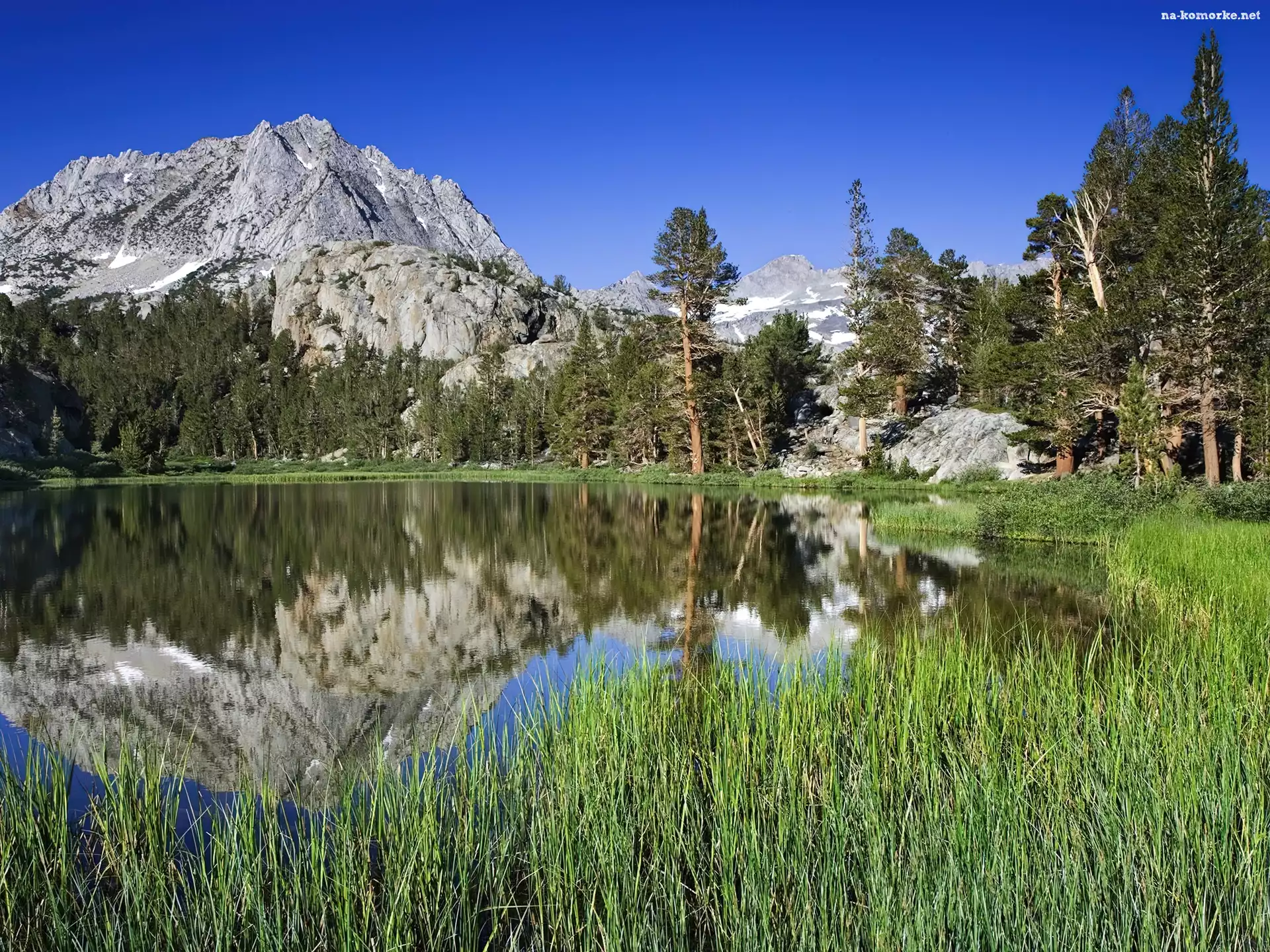 Góry, Odbicie, Jezioro, Trawa na Komórkę