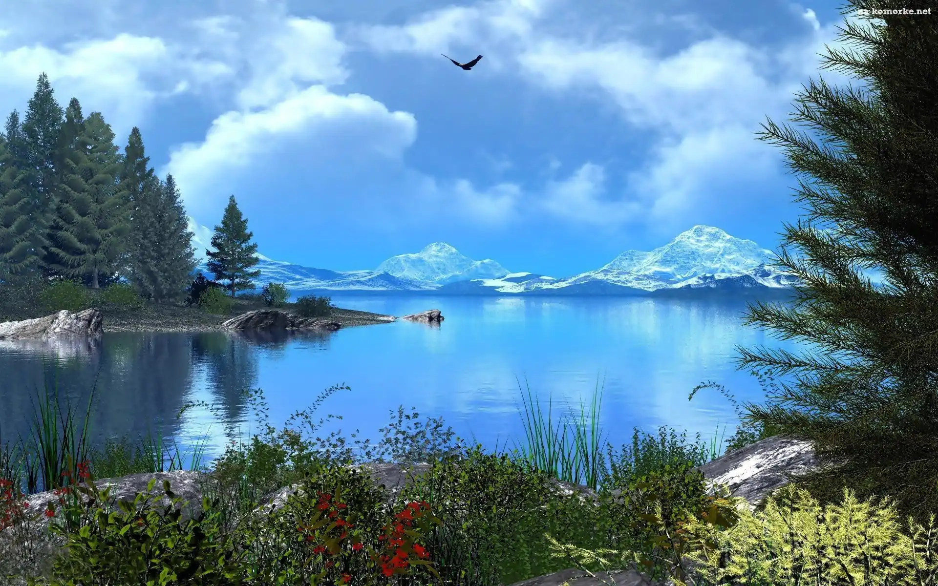 Góry, Ptak, Jezioro, Drzewa na Komórkę