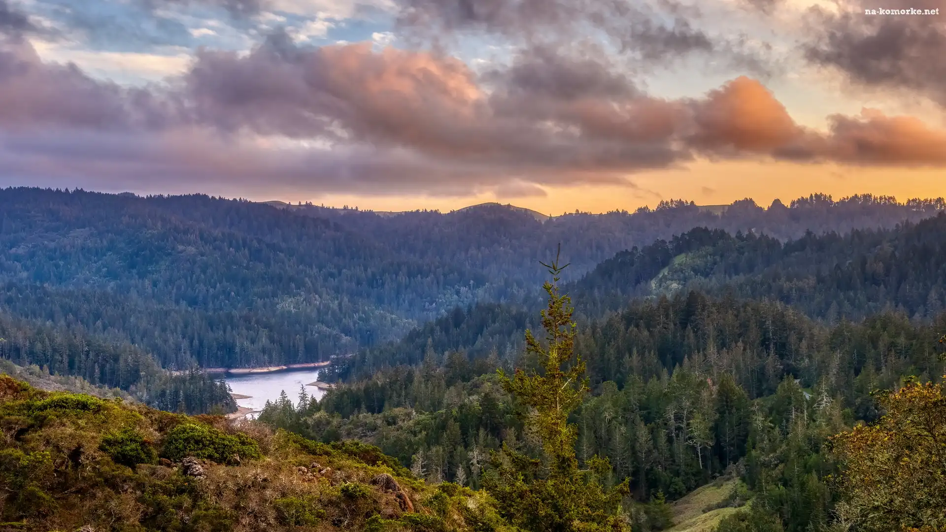 Jezioro, Góry, Zalesione, Chmury, Wzgórza, Zachód słońca na Komórkę