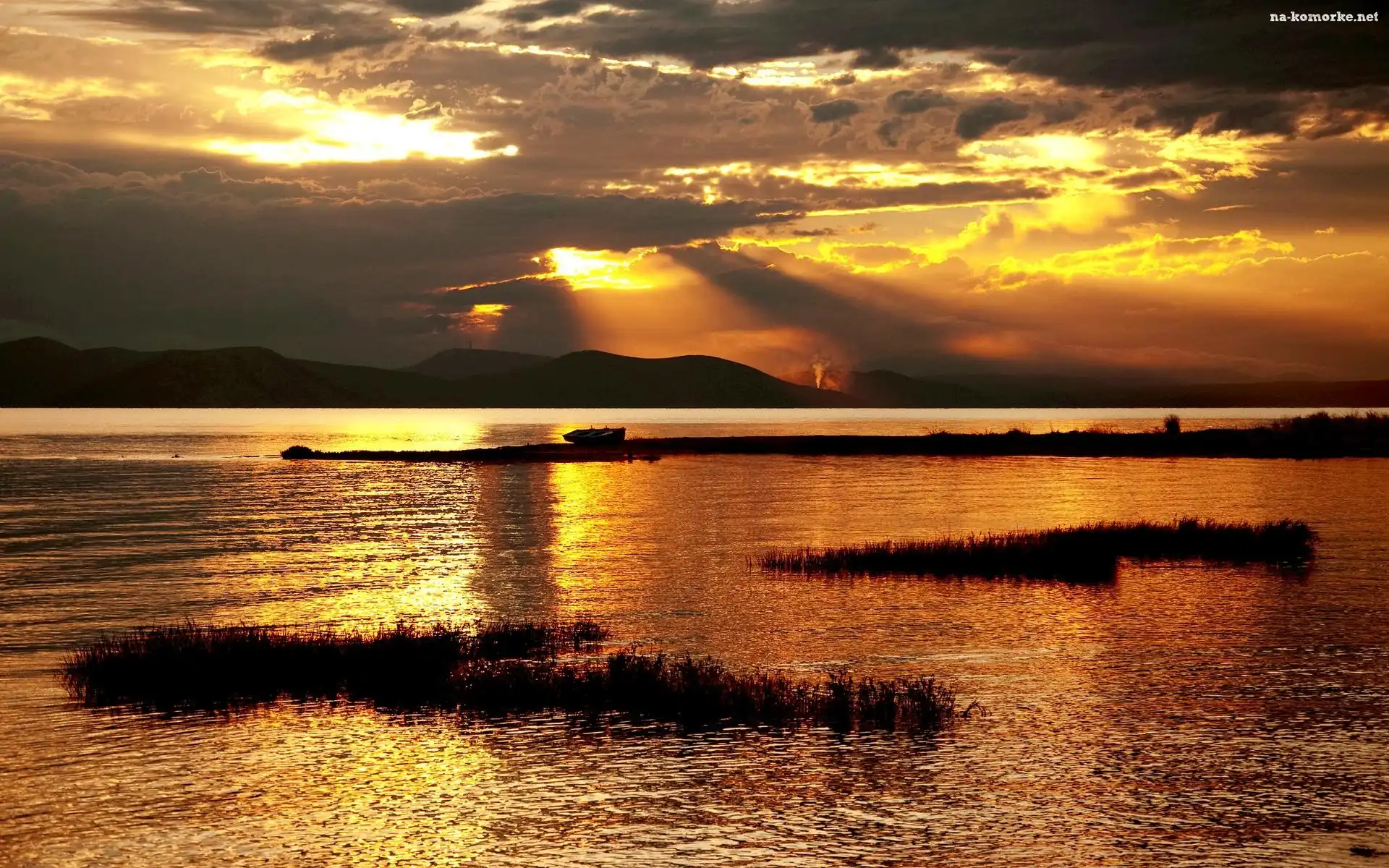 Góry, Słońca, Zachód, Łódka, Jezioro, Promienie na Komórkę