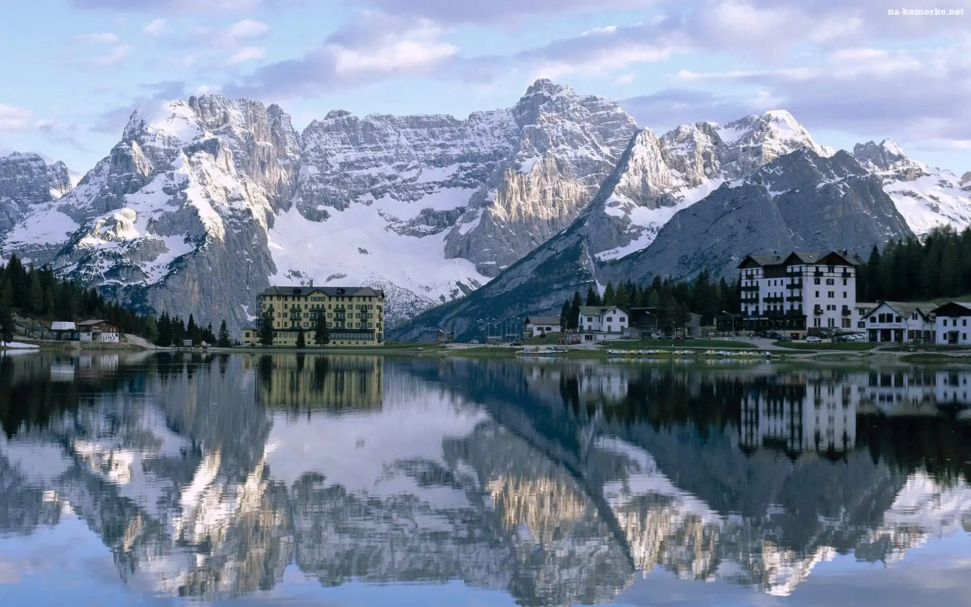 Góry, Zima, Jezioro, Budynki na Komórkę
