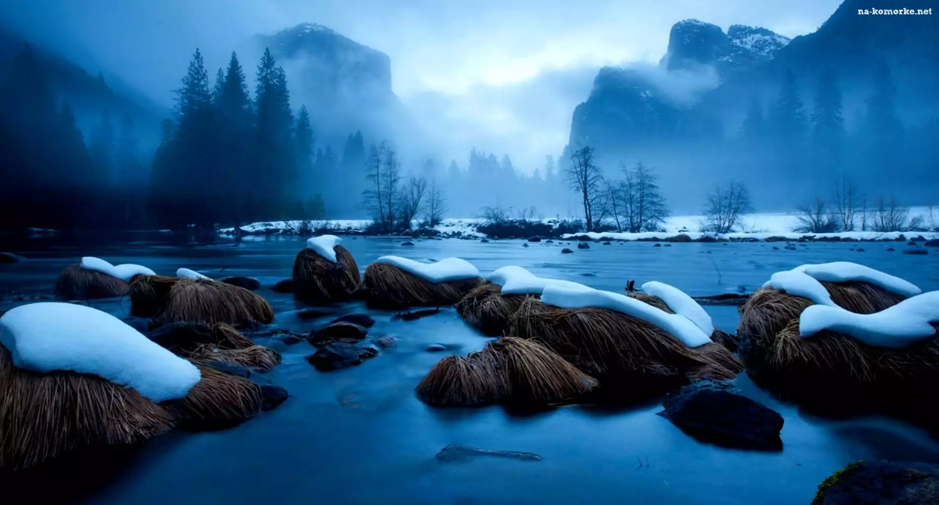Góry, Zima, Jezioro, Trawa na Komórkę