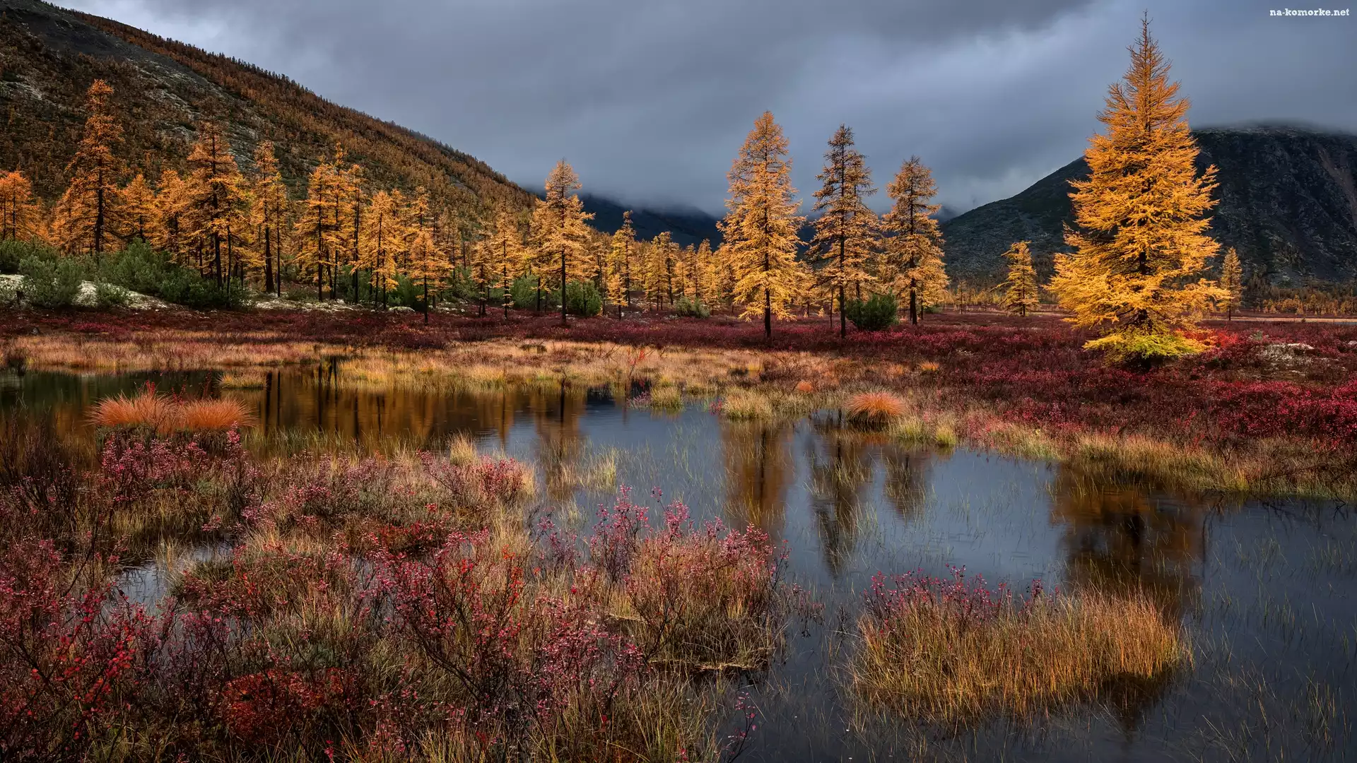 Góry, Drzewa, Jacka Londona, Rosja, Jesień, Krzewy, Jezioro, Kołyma na Komórkę