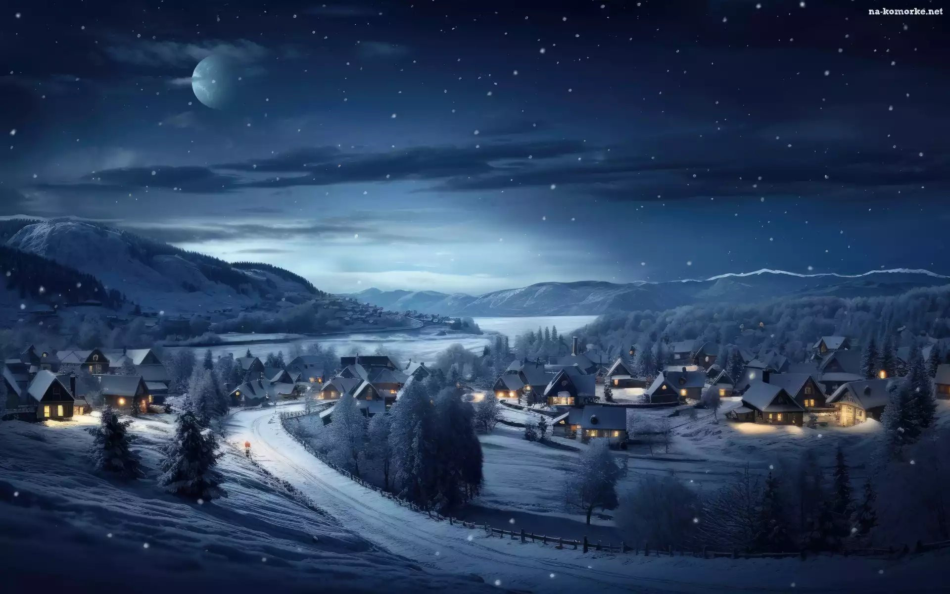 Droga, Noc, Księżyc, Grafika, Drzewa, Zima, Domy, Góry na Komórkę
