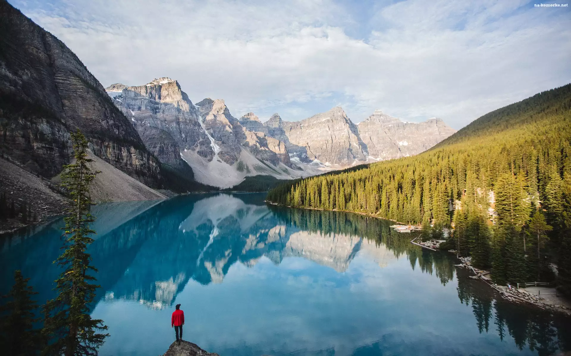 Góry, Mężczyzna, Las, Jezioro na Komórkę