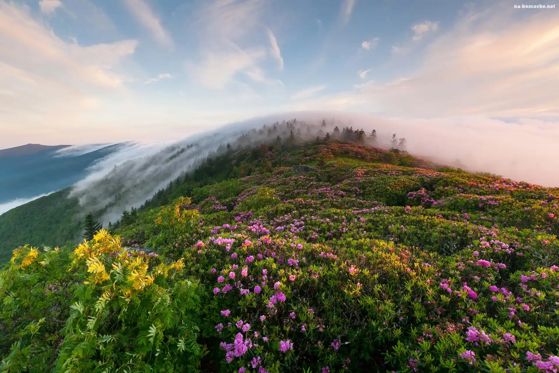 Góry, Kwiaty, Lasy, Mgła na Komórkę