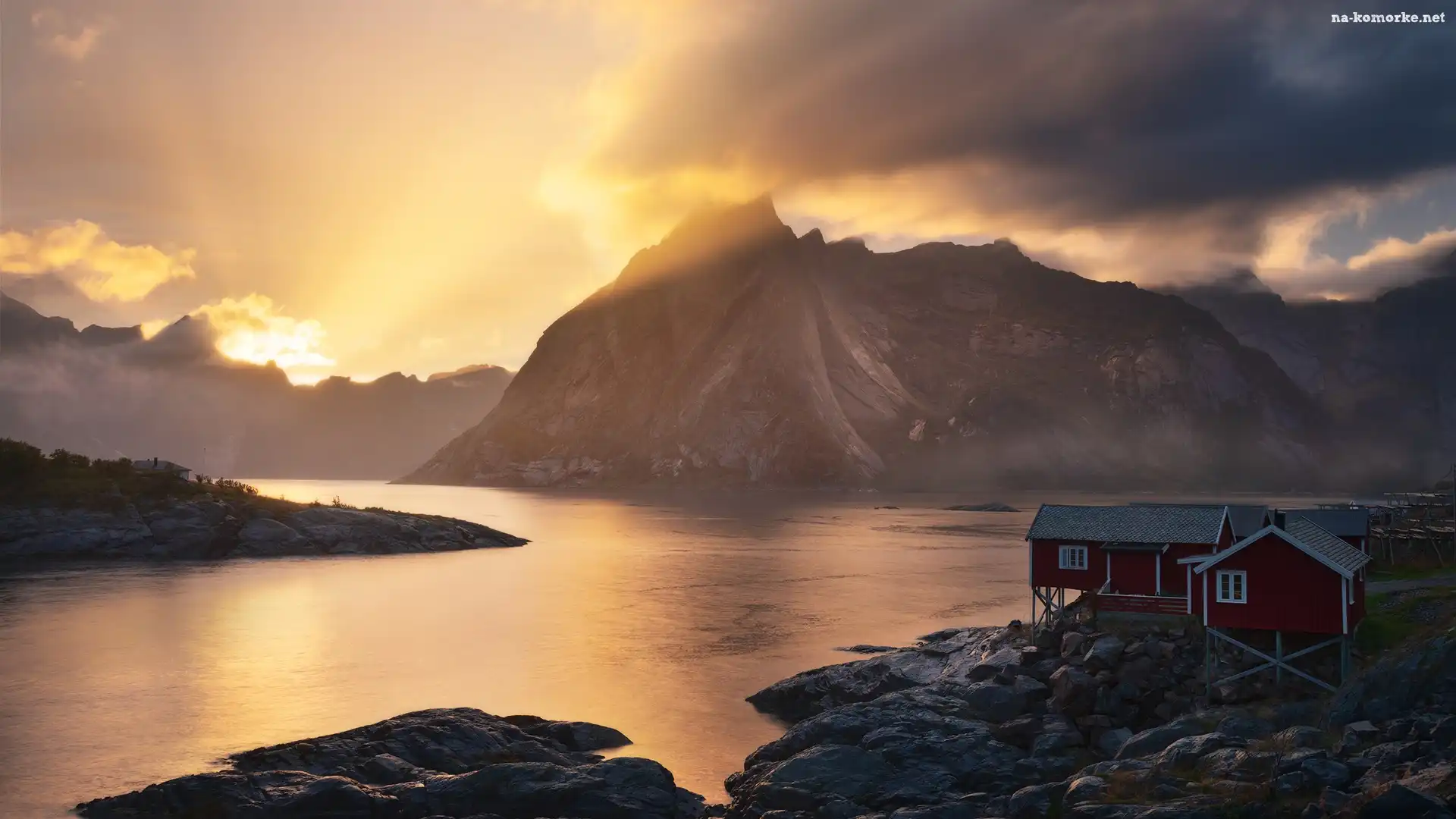 Hamnoy, Lofoty, Morze, Norwegia, Zachód słońca, Domy, Góry na Komórkę