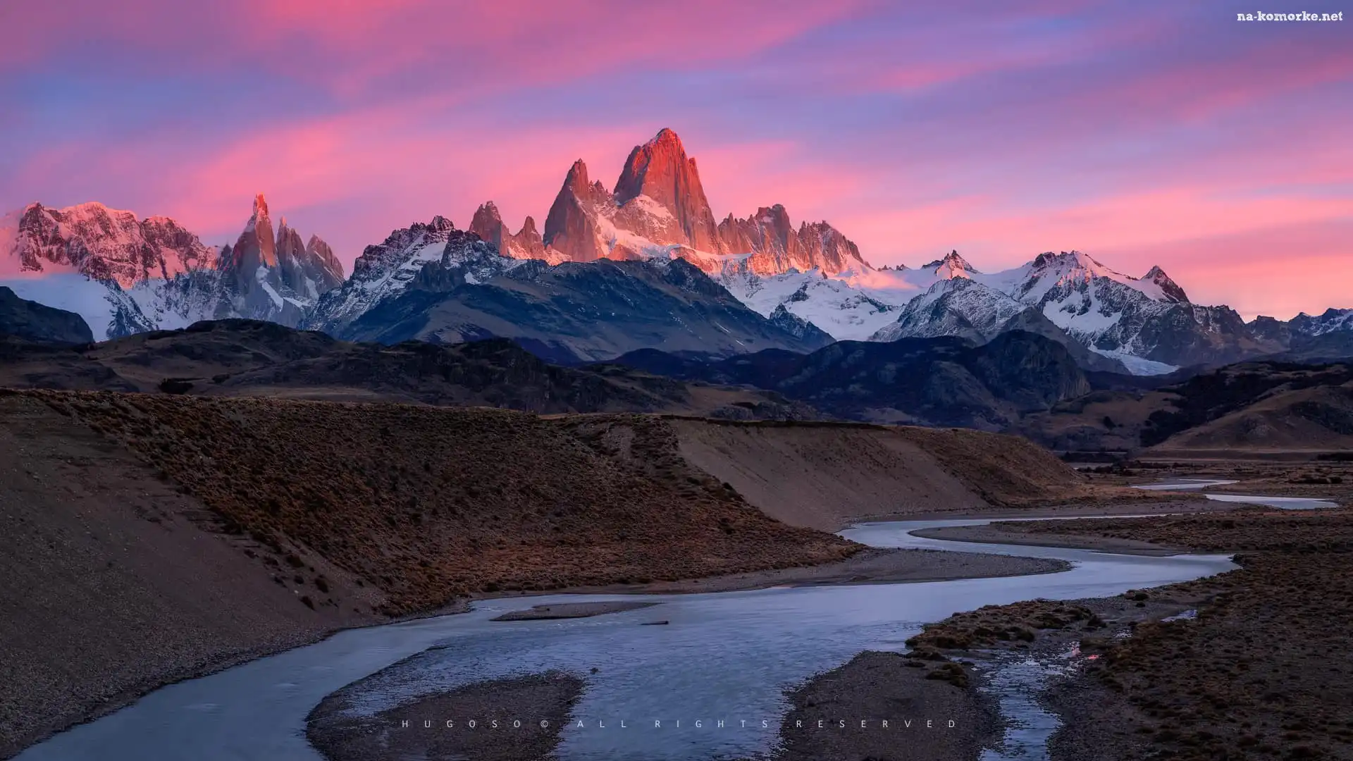 Wschód słońca, Szczyt, Park Narodowy Los Glaciares, Andy, Góry, Patagonia, Argentyna, Fitz Roy, Rzeka na Komórkę |