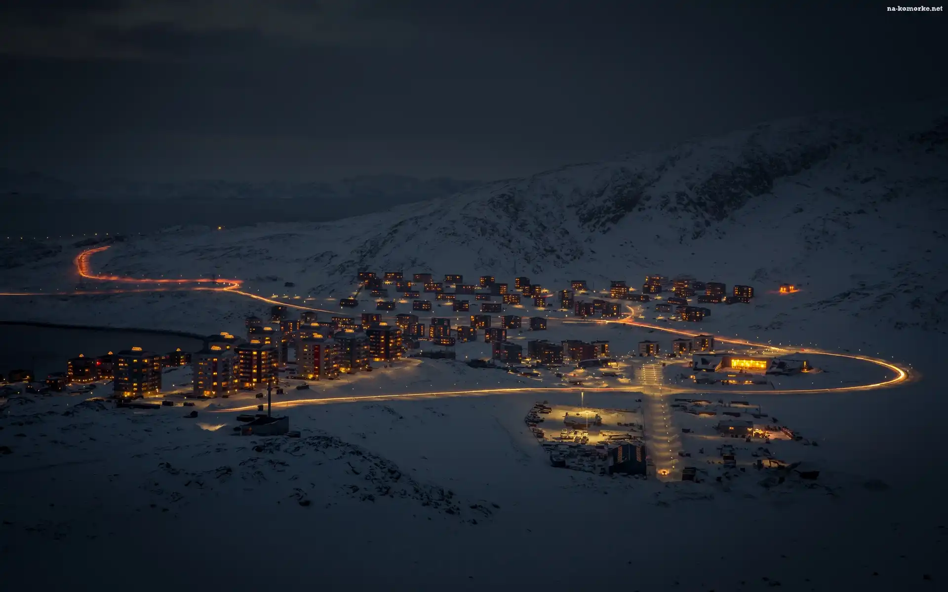 Góry, Grenlandia, Miasto, Nocą, Zima na Komórkę